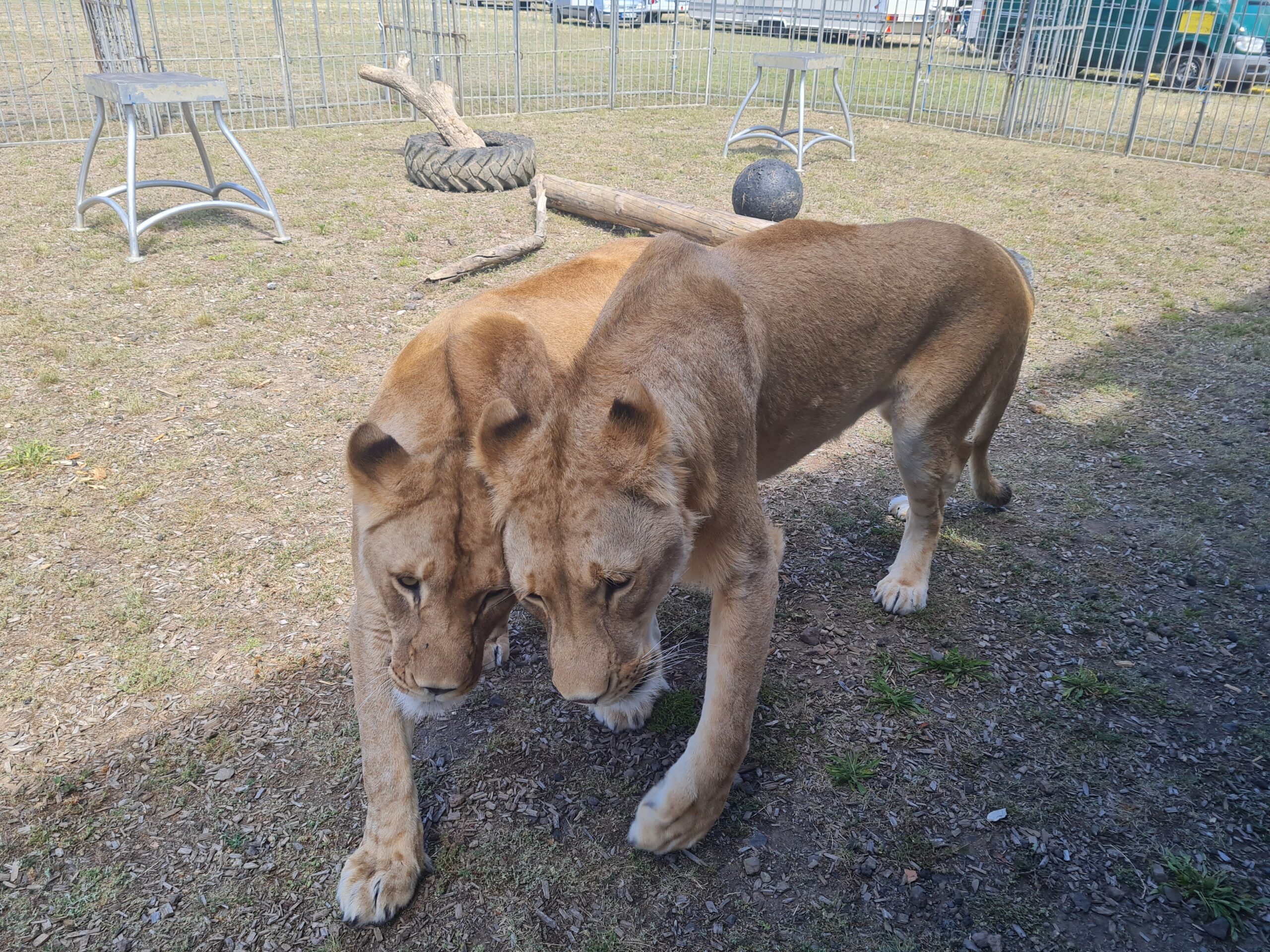 Die beiden Löwen Massai und Manouschka kommen aus einem französischen Wildtierpark. Dort wurden sie laut der Familie Quaiser in Menschenobhut geborgen und mit der Flasche großgezogen. Massai wiegt zirka 180 kg, Löwendame Manouschka wiegt um die 160 kg.