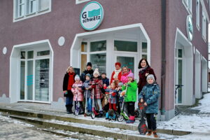 Tina Ströbele und Kerstin Gogolin aus Niedernhall, Manuela Hilkert von DS Immobilien aus Öhringen, Theresa Leitz aus Ingelfingen sowie Matthias Lauterer und Dr. Sandra Hartmann von der Redaktion GSCHWÄTZ spendeten die Roller. Bei der Übergabe am Donnerstag, den 15. Dezember 2022, in der Redaktion GSCHWÄTZ mit Mamas der Kinder sowie mit den ehrenamtliche Helferinnen Christa Marks und Marina Wiegel, strahlten die Kinder nicht nur um die Wette, sondern drehten gleich ein paar Proberunden.