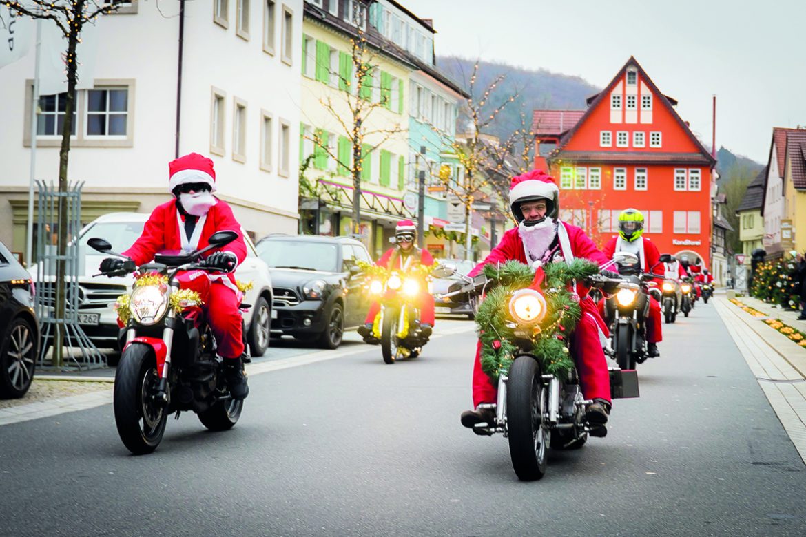 Die Mitglieder des Vereins ‚Harley Davidson Freunde‘ fahren als Engel und Nikoläuse verkleidet am Samstag, den 14. Dezember 2019, mit ihren Motorrädern durch...