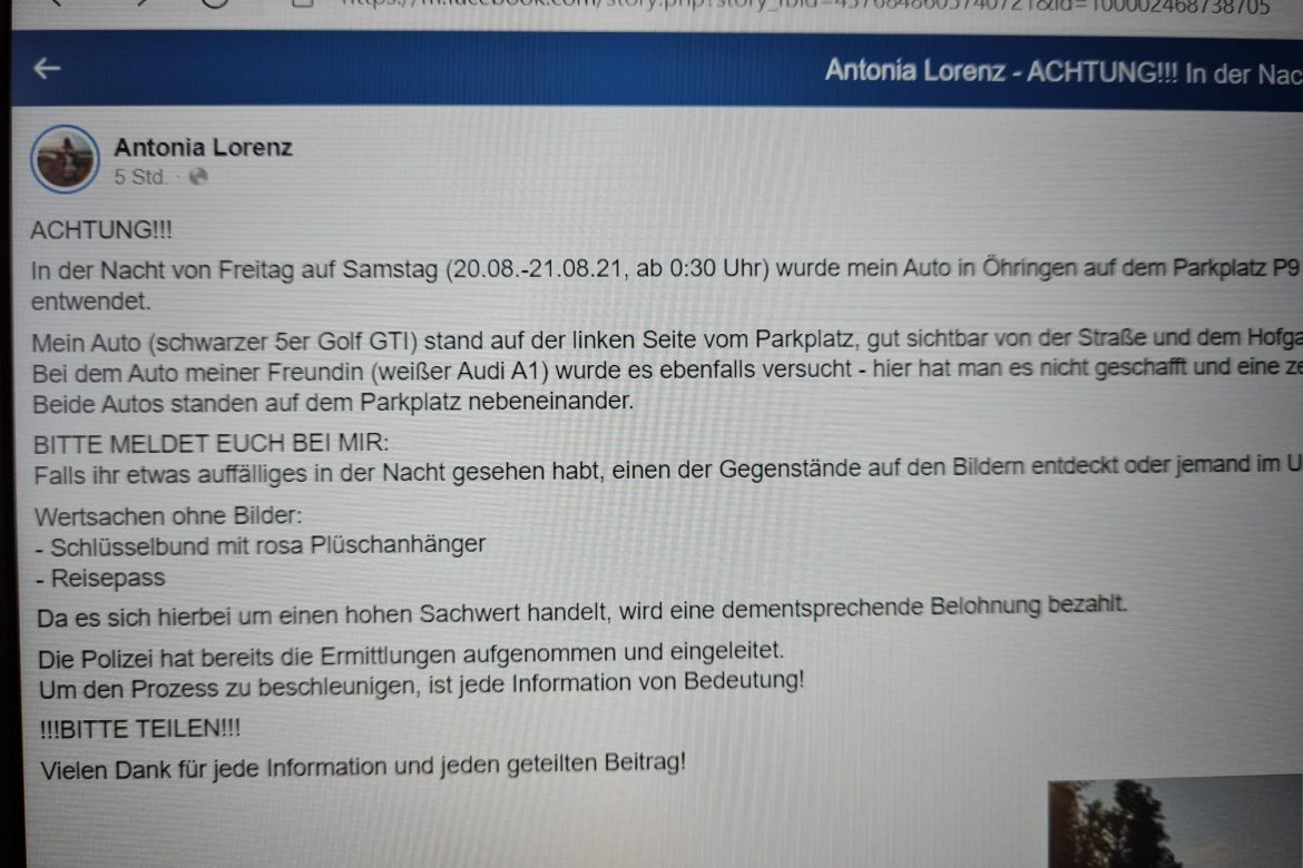 Niedernhallerin warnt auf Facebook vor Dieben in Öhringen.