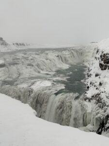 - Wasserfall Gullfoss besonders im Winter durch seine Dimension und halb zugefroren beeindruckend)