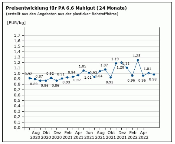 Preisentwicklung eines viel verwendeten Kunststoffs. Quelle: plasticker.de