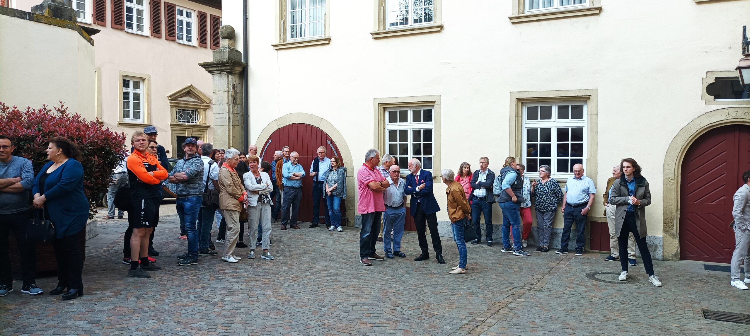 Nachdem Landrat Dr.Neth die Feierlichkeit mit einem Göker-Zitat „Wenn ich in der Politik was zu sagen hätte, gäbs kein Bier mehr, sondern nur noch Wein“ beendet hatte, stehen die Besucher noch lange draußen beisammen.