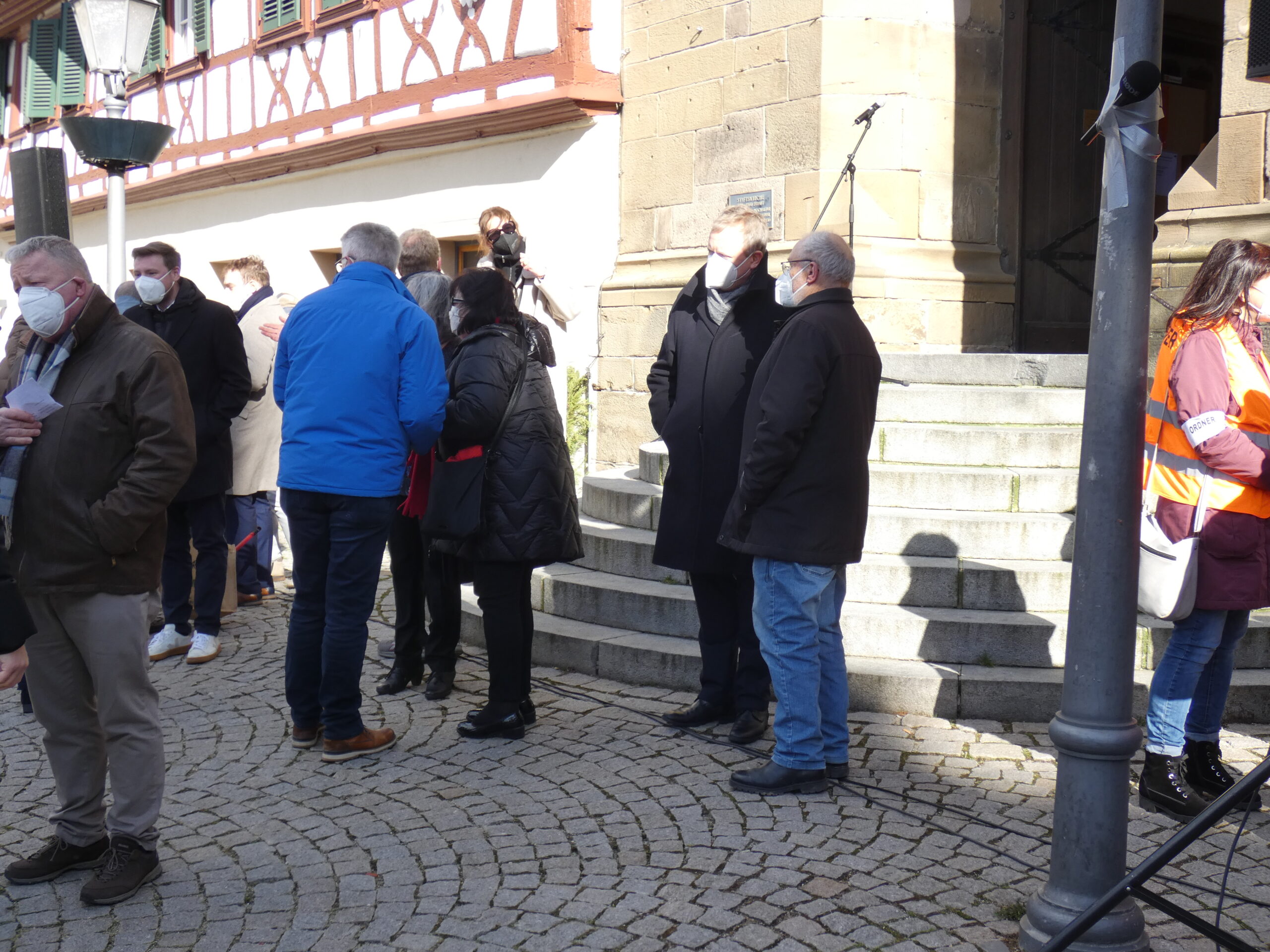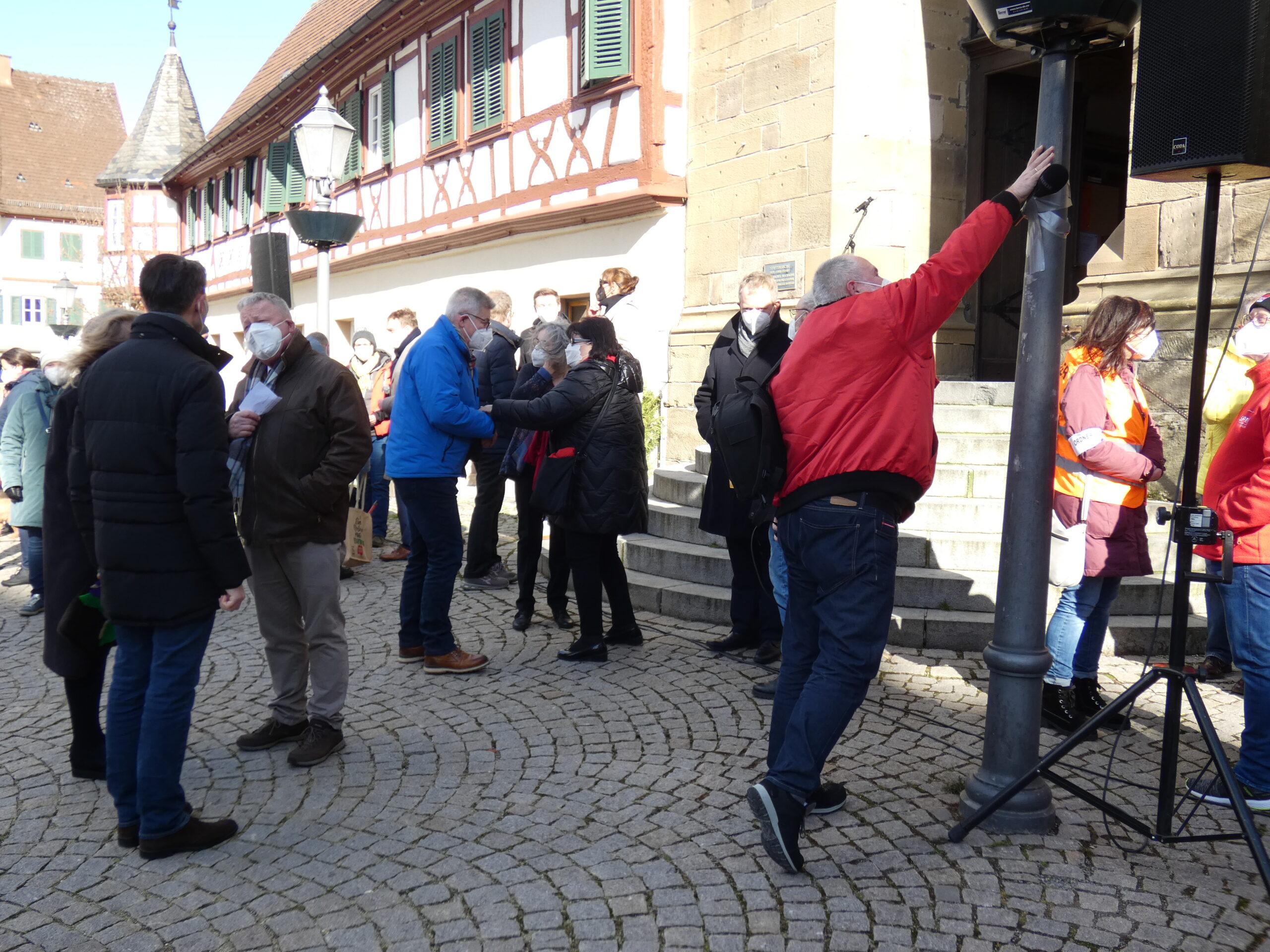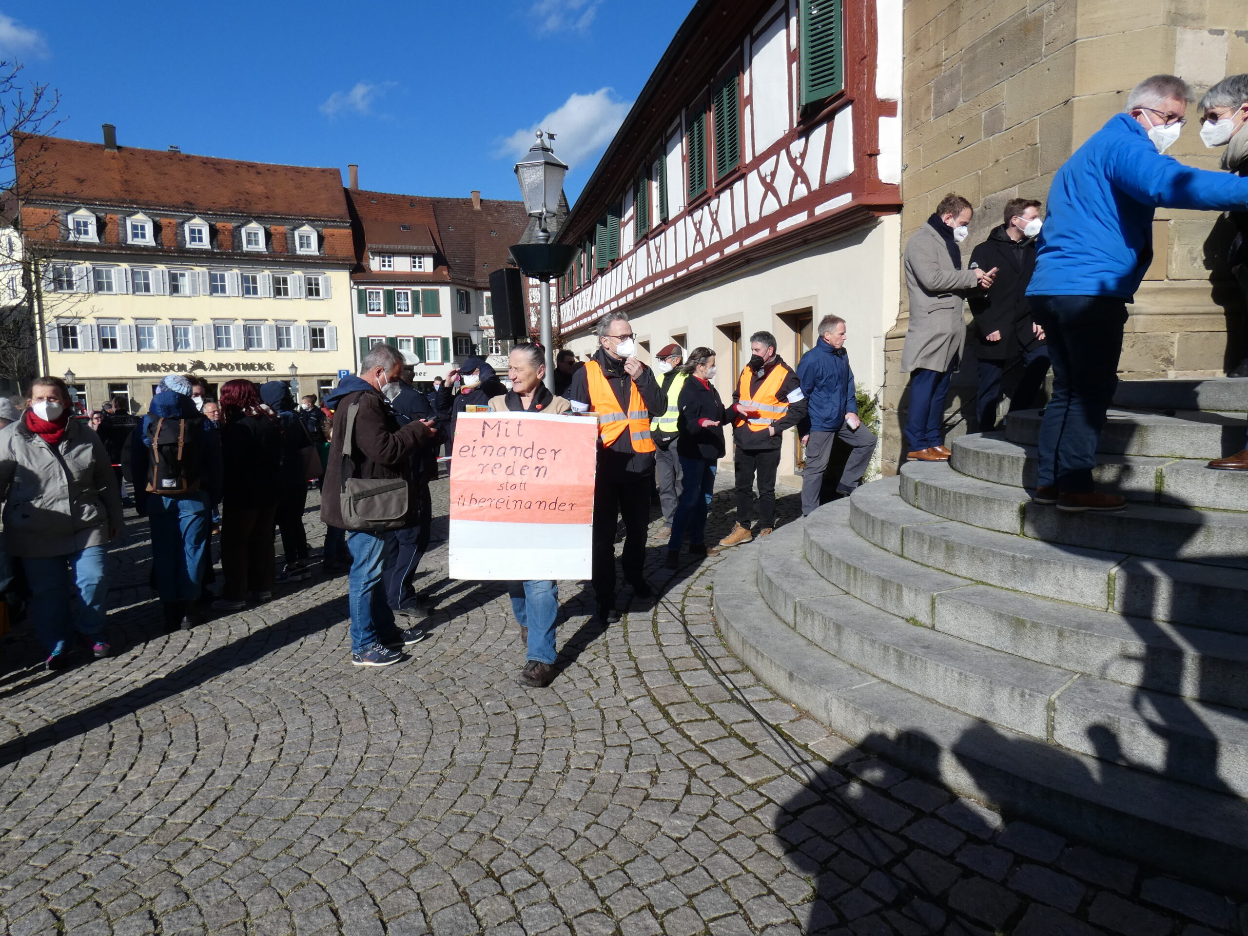 Rund 200 Menschen fanden sich am Samstag, den 19. Februar 2022, auf dem Marktplatz in Öhringen für eine Kundgebung ein, welche der Arbeitskreis „Für Demokratie – gegen Faschismus“ unter der Federführung von dem Lokalpolitiker Hans-Jürgen Saknus (SPD) organisiert hat (wir berichteten). Die Kundgebung sollte ein Zeichen gegen die Montagsspaziergänge sein, die derzeit überall, auch im Hohenlohekreis stattfinden, und unter anderem die Coronaverordnungen und die Politik im Allgemeinen kritisieren (wir berichteten).