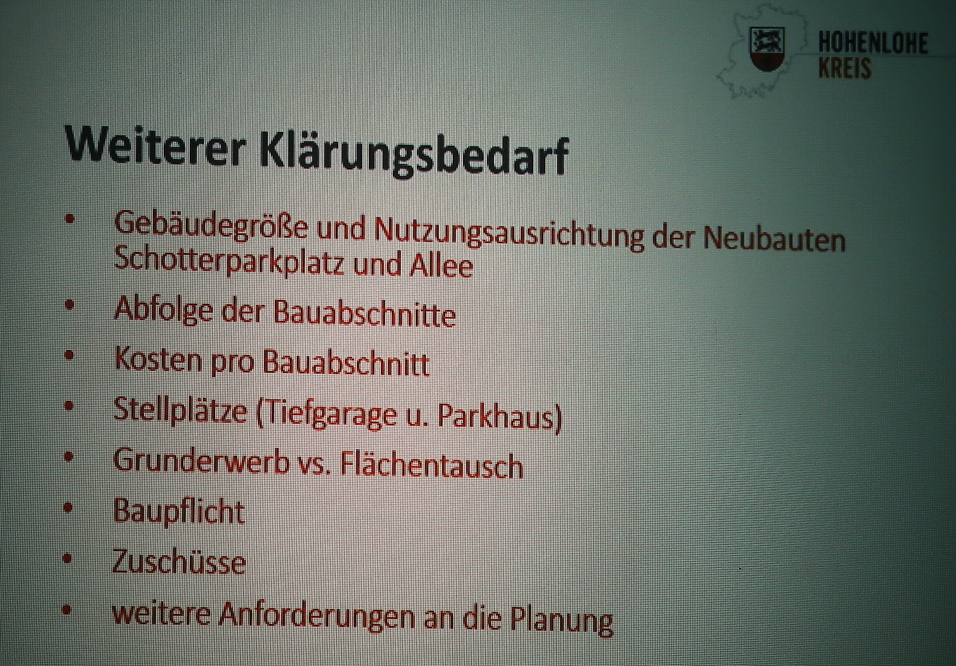 Die laufenden großen Projekte betrachtet sie wie folgt: Der Krankenhausneubau in Öhringen liege im Kosten- und Zeitrahmen. Besondere Freude empfindet sie darüber, dass das Personal jetzt wieder nach dem Tarifvertrag des öffentlichen Dienstes bezahlt werde. Den Fortschritt beim Kreishaus kritisiert sie: Da „liegen wir immer noch in schmerzhaften Wehen“. In der Verkehrspolitik fordert sie, auch im Hinblick auf das Gutachten zur Kochertalbahn, den NVH und die Bahn, also den Ausbau der Stadtbahnstrecke bis mindestens Waldenburg gemeinsam zu betrachten.