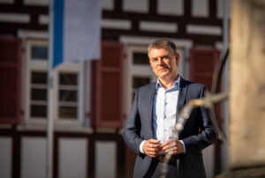 Ian Schölzel, Erster Bürgermeister von Waiblingen vor dem Rathaus in Unterweissach, bewirbt sich als neuer Landrat für den Hohenlohekreis. Foto: Alexander Becher