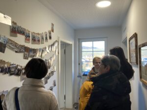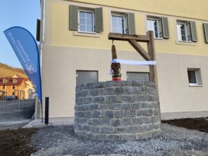 Anders als beim Richtfest am 25. Februar 2022 scheint die Sonne und wärmt die Wintermäntel der Besucher:Innen, die sich trotz Temperaturen unter dem Gefrierpunkt um den neuentdeckten (aber alten) Brunnen vor dem Haus an der Linde versammelt haben.