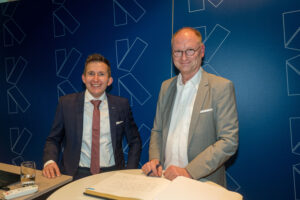 Sven Plöger trägt sich in das Goldene Buch der Stadt ein. Bürgermeister Stefan Neumann – links im Bild.