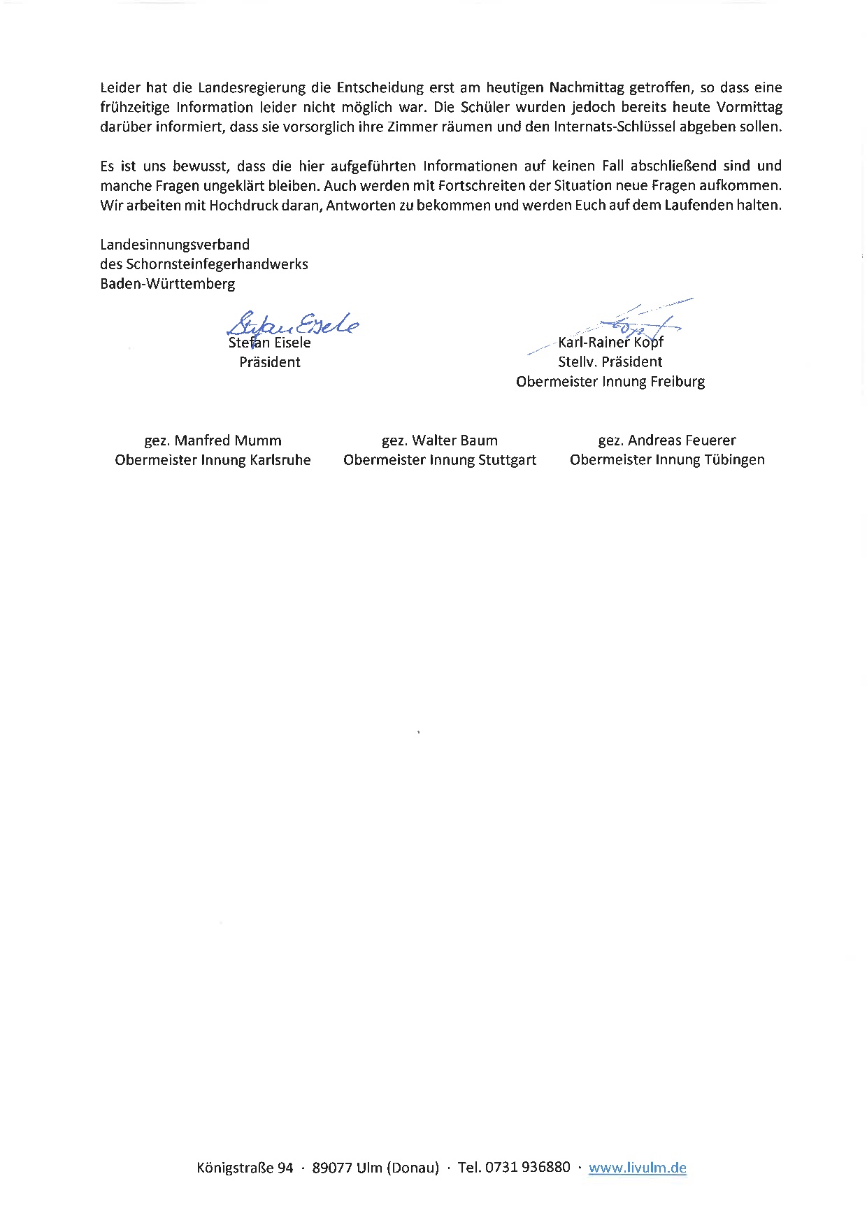 Screenhot des Schreibens des Präsidenten der Schornsteinfegerinnung.