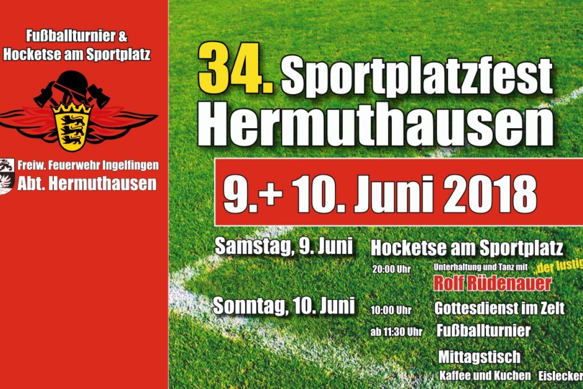 Am Samstag, den 9. Juni 2018 und am Sonntag, den 10 Juni 2018, feiert Hermuthausen sein 34. Sportplatzfest. Am Samstag, ab 18.30 Uhr, gibt es eine Hocketse am Sportplatz angeboten mit Barbetrieb und Bierkisten schießen und ab 20 Uhr gibt es Unterhaltung und Tanz mit Rolf Rüdenauer. Am Sonntag gibt es um 10 Uhr einen […]