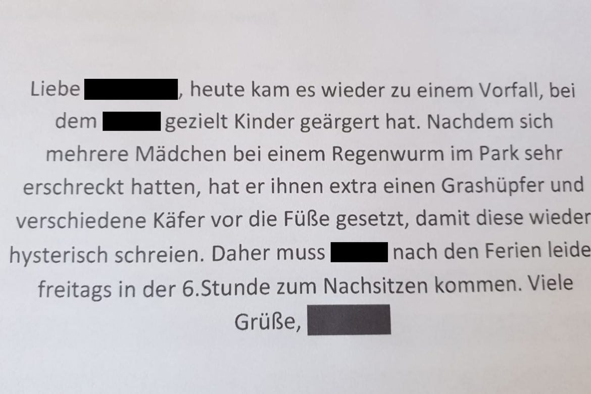 Wie wild dürfen Kinder sein? Wann gilt es, als Lehrkraft durchzugreifen? Wann sollten disziplinare Maßnahmen wie etwa Nachsitzen ergriffen werden? Tagtäglich stehen Lehrer vor diesem Dilemma. Nun hat ein Lehrer einen seiner Schüler zum Nachsitzen verdonnert. Die Mutter hat den Grund für das Nachsitzen erfahren und kann diesen bis heute nicht wirklich nachvollziehen. „Ich könnte […]