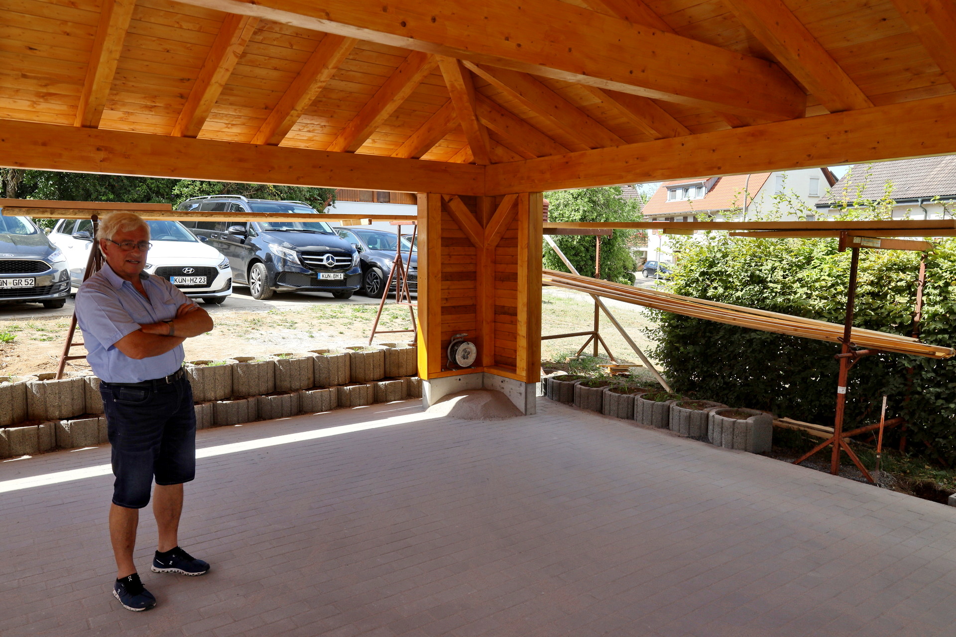 Neben dem neu aufgebauten Lügenbrückle (GSCHWÄTZ berichtete) gibt es weitere erfolgreiche Initiativen, die mit Mitteln des Bürgerbudgets gefördert wurden. Gerhard Rudolph, Ortsvorsteher von Amrichshausen, präsentiert stolz den neuen Pavillion zwischen Dorfplatz und Kirche. „Es hat sich gezeigt, dass die Menschen nach Hochzeiten gerne einen Platz für einen Sektempfang haben – das ist jetzt ein idealer Ort für so einen Sektempfang, eine kleine Hocketse oder eine kleine Feier“, meint er. Aber alles soll im Rahmen sein, „wilde Feste wollen wir an dieser Stelle nicht“. Deshalb gibt es auch keine fest installierten Sitzgelegenheiten.