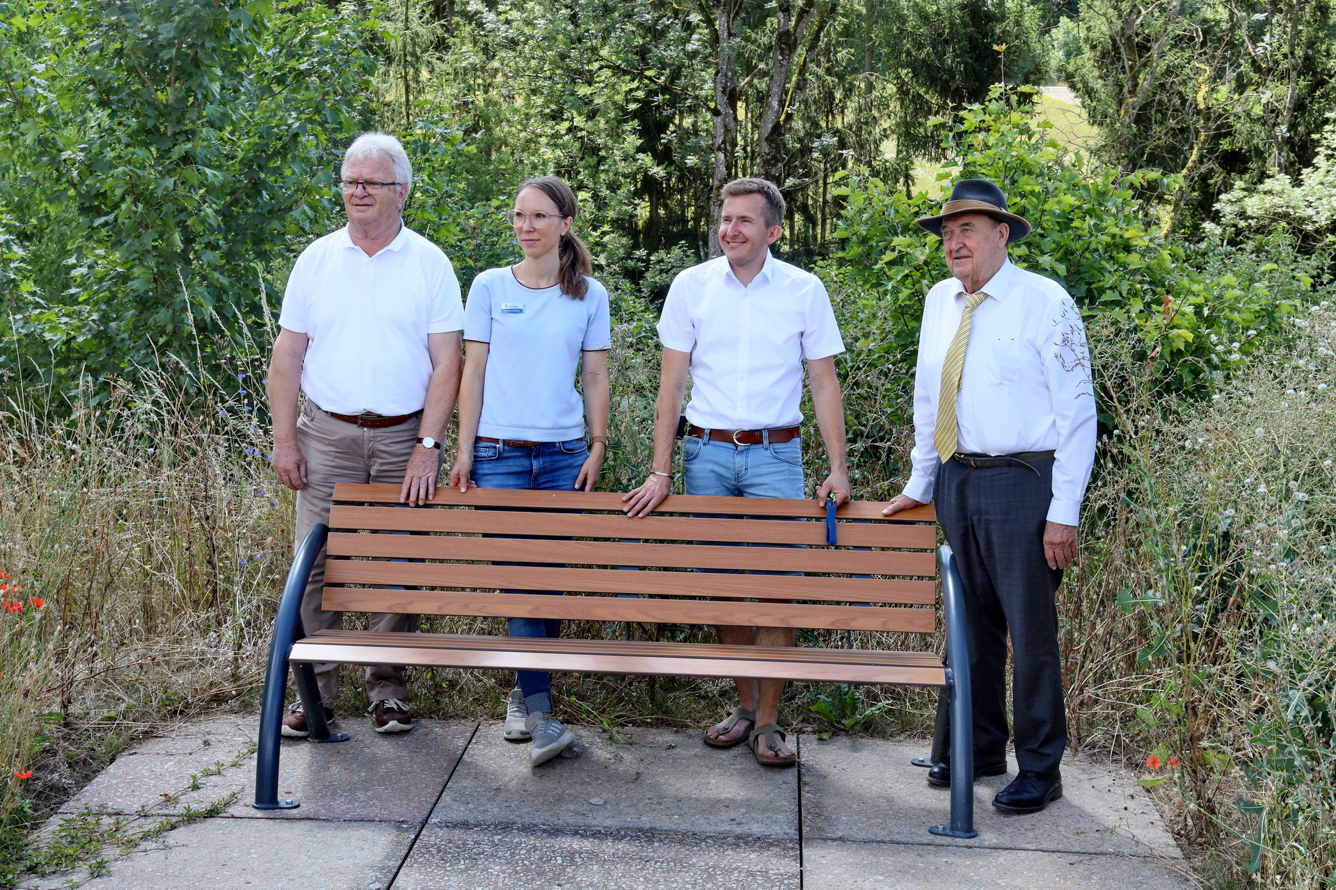 Ernst Gruber, Rafaela van Dorp, Stefan Neumann und Prof. Dr. Wofgang Freiherr von Stetten präsentieren eine der neuen Bänke. Foto: GSCHWÄTZ