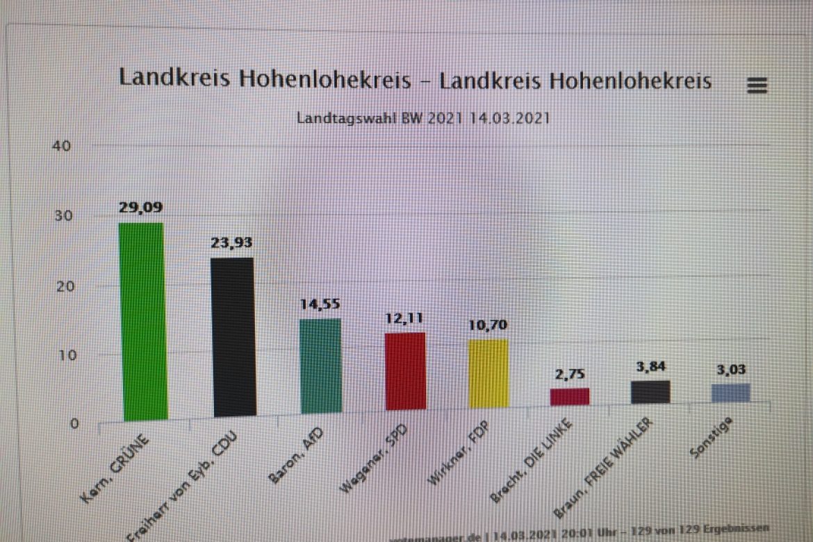 Erste Ergebnisse bei der Landtagswahl in Baden-Württemberg und den Hohenlohekreis. Gibt das die Blaupause für die Bundestagswahlen im Herbst 2021? Grün regiert all alone als die neue und aktuell einzig reale Volkspartei.