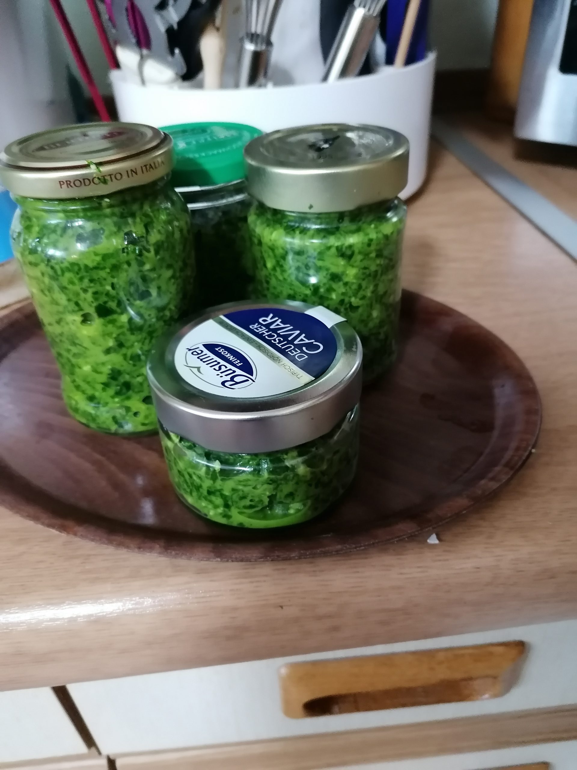 Für das Pesto den pürierten Bärlauch mit Öl und Pinienkernen vermischen. Zum Schluss noch salzen. Beim Öl kann man Oliven- oder auch Sonnenblumenöl nehmen. Wenn man den Bärlauch püriert, sollte man immer schon ein bisschen Salz und Öl dazugeben, dann geht es besser. Am besten dann auch gleich die Pinienkerne dazugeben, dann sind diese ebenfalls schon zerkleinert. Das Pesto in Gläser füllen und kühl stellen. Hält sich etwa ein Jahr. Man kann dann auch schon den Parmesan dazugeben, dann ist die Haltbarkeit aber wesentlich kürzer.