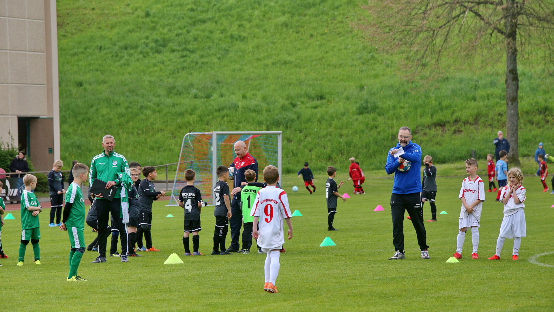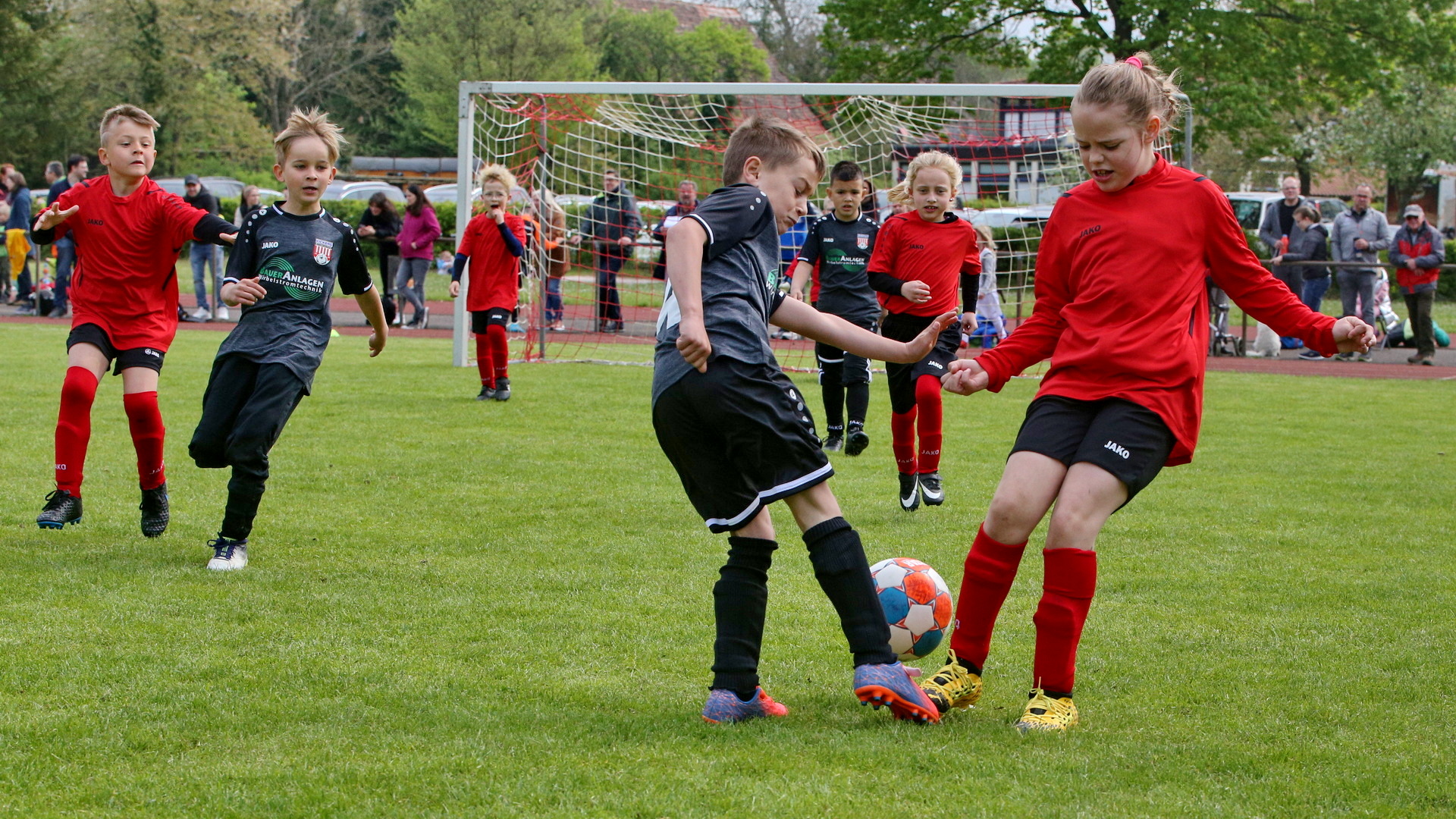 Auf 10 Feldern wird gleichzeitig gespielt, allein bei den Bambini treten 23 Dreier-Mannschaften an, die jeweils 9 Minuten ohne Auswechslung Volldampf geben. Die F-Jugend spielt mit vier Feldspielern und Torwart auf schon ziemlich große Tore.