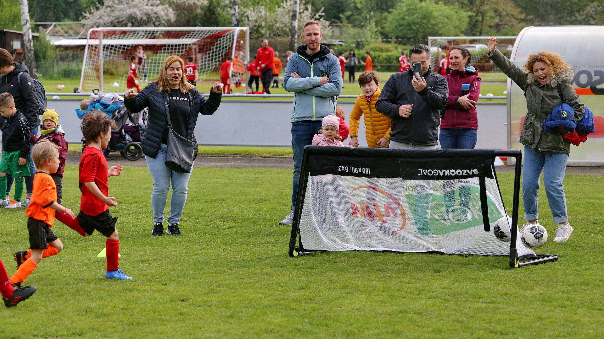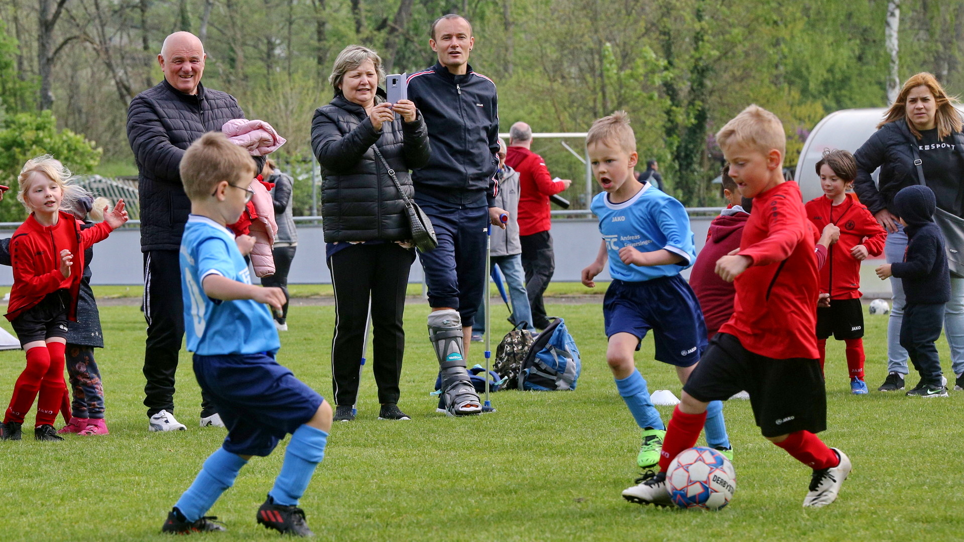 Weil Fußball ein Familiensport ist, haben fast alle Kinder mindestens ein Elternteil mitgebracht. Und natürlich bewundern auch viele Großeltern ihre Enkelkinder beim Spiel. Zwischendrin will ein kleineres Geschwisterkind auch mitspielen, schnappt sich den Ball, der im Aus war und rennt mit ihm davon.