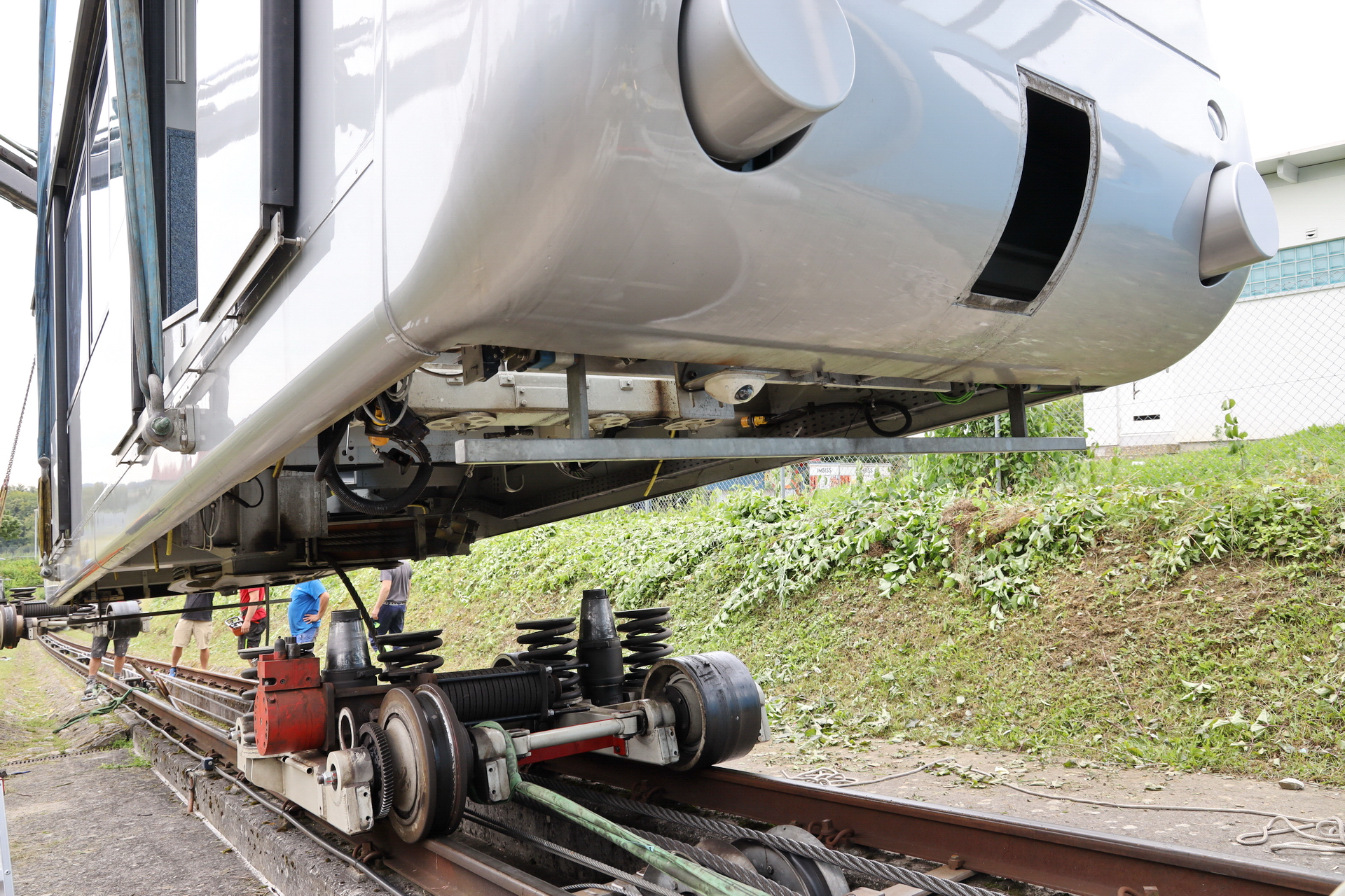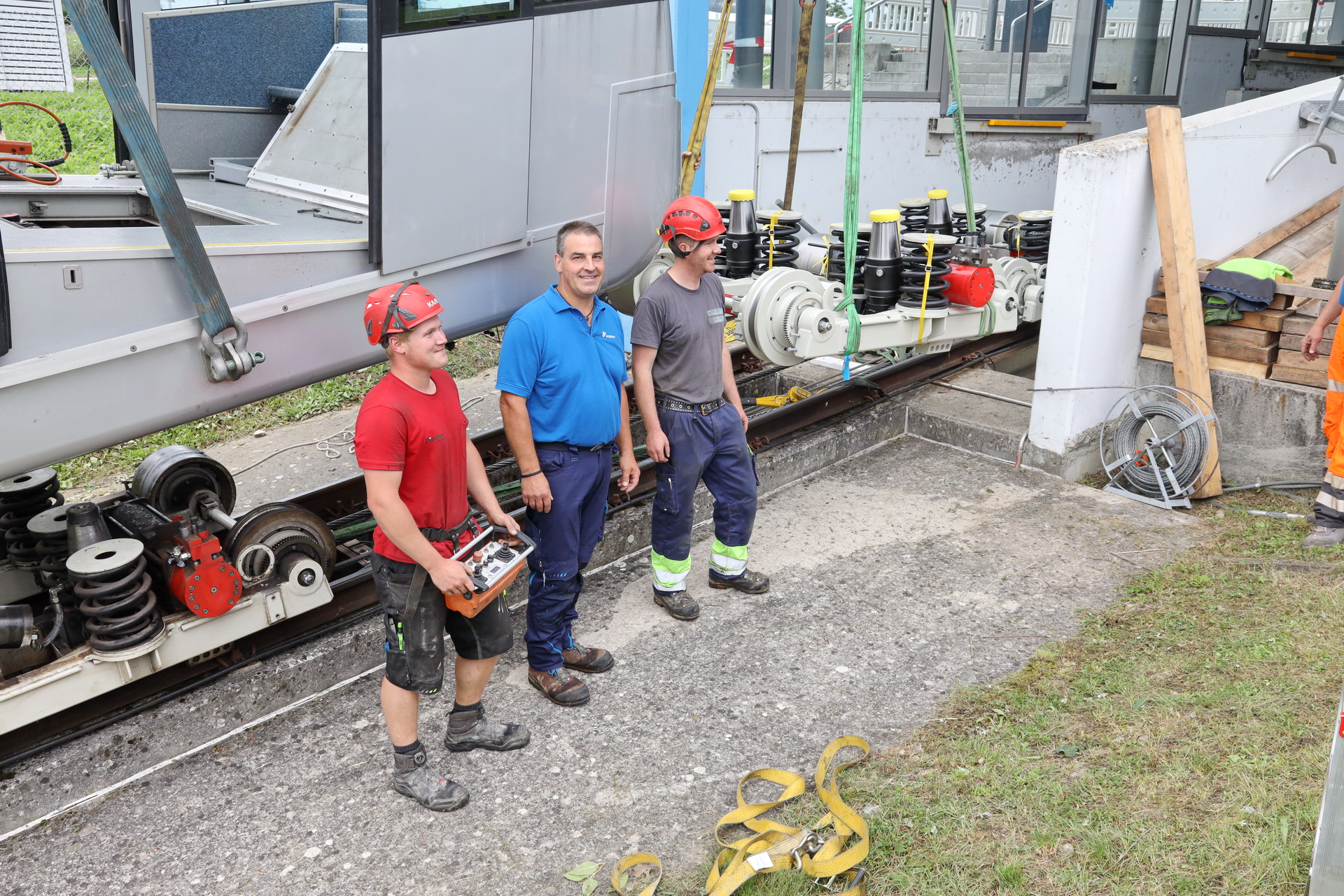 Der Wechsel ist gut geplant: Die alten Drehgestelle werden gelöst, danach wird der Waggon mit einem Kran angehoben. Die alten Drehgestelle rollen einige Meter nach unten, bevor die neuen Drehgestelle, die bereits in der Bergstation auf der Schiene auf ihren Einsatz warten, unter den Waggon gefahren werden und der Waggon abgesenkt wird.