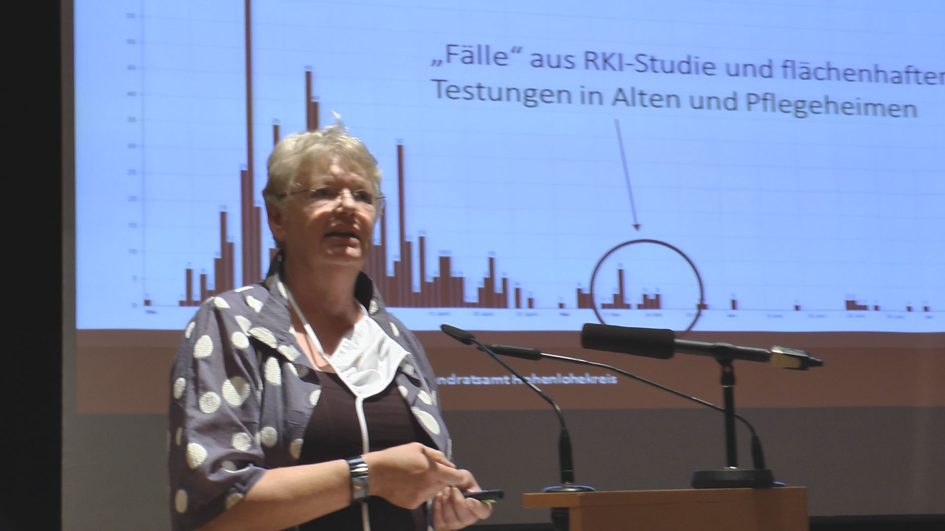 Neben Lucha referierte die Leiterin des Gesundheitsamtes Künzelsau, Dr. Antje Haack-Erdmann, über die gewonnenen Erfahrungen im Umgang mit dem Virus und das weitere Vorgehen seiner Eingrenzung, inklusive der Recherche relevanter Überträger und Kontaktpersonen. „Wir sind immer noch an erster Stelle pro 100.000 Einwohner in Baden-Württemberg“, So Dr. Haack-Erdmann. „Wir hatten 47 Menschen, die direkt an Covid verstorben sind, und im Moment ist unsere Sieben-Tage-Inzidenz 5,3.“ Das Fazit der Leiterin des Gesundheitsamtes: „Was wir gelernt haben, finde ich hier interessant: Wir hatten hier nochmal im Mai einzelne Fälle, die aus dem flächendeckenden Untersuchungen gekommen sind, die einfach keine richtigen Fälle waren. Wo einfach falsch-positive Ergebnisse dazu führen, dass man sehr viel Arbeit hat, dass man den Verdacht hat, man hat Infektionskrankheiten, die keine sind. Und deswegen haben Sie ja auch in der Teststrategie entsprechend reagiert, dass diese großen, flächenhaften Untersuchungen nicht sinnvoll sind, sondern wir müssen immer an ein Ausbruchsgeschehen adaptiert sein, damit sie Sinn machen“. Was ihr zurzeit Sorgen mache, seien vor allem die Reiserückkehrer. „Wir alle haben Angst vor einer so genannten zweiten Welle und wir haben jetzt auch Einzelfälle von Reiserückkehrern, die eben durch das gute Management, die gute Fallermittlung auf diese Ausbrüche beschränkt waren. Wir haben zwar 50 Kontaktpersonen, aber im Moment nur fünf Fälle, die akut infiziert sind“.