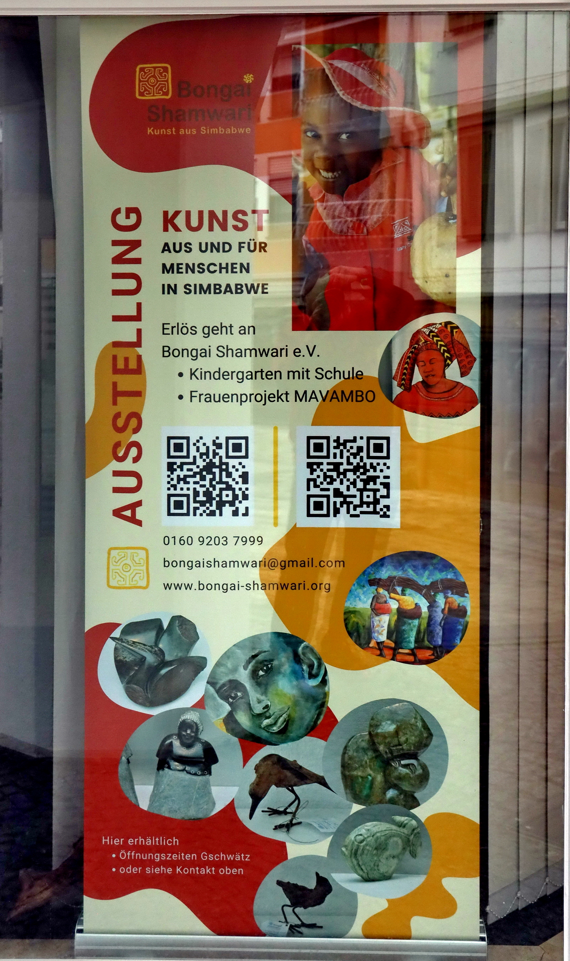 In der Ausstellung „Hohenlohe meets Simbabwe“ zeigten im Frühjahr verschiedene Künstler ihre Werke in der Sparkasse in Künzelsau. Die Schau wurde wegen Corona abgebrochen, die Künstler mussten eilends in ihre Heimat zurück. Diese Ausstellung soll 2021 wiederholt werden. Außerdem hat der Verein zwei Schaufenster in Ingelfingen – in der Schlossstraße und der Mariannenstraße angemietet – und stellt dort Bilder und Skulpturen aus Simbabwe aus, die über Christa Zeller verkauft werden. Auch bei Hohenloher Hörakustik in der Künzelsauer Hauptstraße sind Werke ausgestellt. Die Kunstwerke werden in Simbabwe hergestellt und gelangen per Container nach Deutschland.