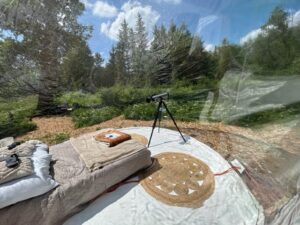 Das Besondere des Tents ist dann auch wirklich die Nacht. Denn: Nachts sieht man das Weichplastik der Bubble nicht mehr und man hat wirklich das Gefühl, direkt unter dem Sternenhimmel umringt von Bäumen zu liegen. Man hört nur das leise Brummen des Luftgenerators. Morgens wird man – ungelogen – geweckt von Vogelgezwitscher. Man sollte daher die Nacht und auch den Morgen nutzen, in dem großen Doppelbett noch etwas länger liegen- und wachzubleiben, um der Natur zu lauschen und durch das bereitstehende Teleskop, nachts den Sternen noch etwas näher zu kommen.