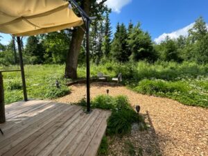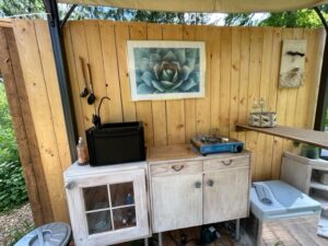In Ingolstadt gibt es neben dem Bubble Tent noch eine selbst gezimmerte Campingküche aus Holz. Ein junges Paar vermietet das Tent für rund 200 Euro die Nacht. Hat man Fragen oder benötigt man noch irgendetwas, sind sie sofort zur Stelle. Service wird hier groß geschrieben. Back to basic heißt es hier, aber mit Stil, alles gehalten in Naturtönen mit möglichst wenig Eingriffen in die Natur. Es gibt hier Elektrizität in Form von 2 Steckdosen (für die Solardusche sowie eine Gefrierbox), aber kein fließend Wasser. Das wird mittels händischer Pumpe selbst befördert, was aber kein Problem ist. Ein Trocken-WC steht ebenfalls bereit – mit einem Eimer Sägespänen zum Darüberschütten daneben, das den Geruch neutralisiert. Mit einer Campingherdplatte kann man sich sein Essen warm machen (wenn man denn weiß, wie man Gaskartuschen wechseln kann, aber zum Glück gibt es ja Mister Google und die Besitzer:innen des Tents, die einem mit Rat und Rat zur Seite stehen ;-)) und am ebenfalls selbstgebauten Bartresen essen oder nicht weit entfernt am Baggersee mit seinen diversen gastronomischen Angeboten.