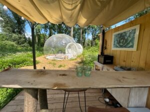 Es gibt mehrere Bubble-Tent-Standorte in Deutschland. Je schattiger der Standort, umso besser. Denn sonst läuft man Gefahr, sich tagsüber in einer Sauna aufzuhalten. Sobald die direkte Sonneneinstrahlung weg ist, kühlt sich das Tent aber auch sehr schnell wieder ab. Abends kann es durchaus sein, dass man dafür eine Heizdecke braucht, auch in den Sommermonaten wie Juni. Aber damit kommt man dann sehr kuschlig-bequem durch die Nacht.