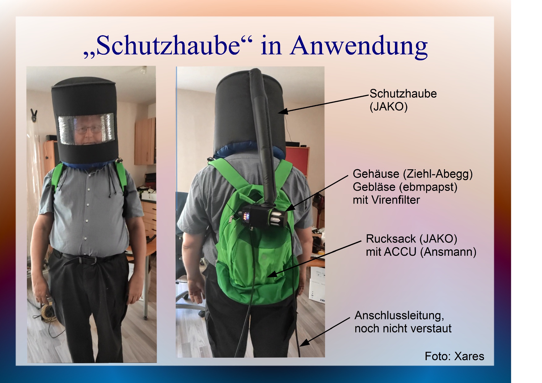 „Es handelt sich hierbei um eine Haube, die komplett über den Kopf gezogen wird“, erklärt Professor Wystup, der vor seiner aktuellen Professur für Elektrotechnik in Eisenach als Lehrbeauftragter am Campus Künzelsau tätig war. „Die Haube erinnert an einen Taucherhelm aus Stoff.“ Eine akkubetriebene Gebläseeinheit soll den Träger mit frischer, virenfreier Luft versorgen. Die Haube sei für das medizinische Personal und für Mitarbeiter der Pflege gedacht, damit diese Menschen weiterarbeiten können.