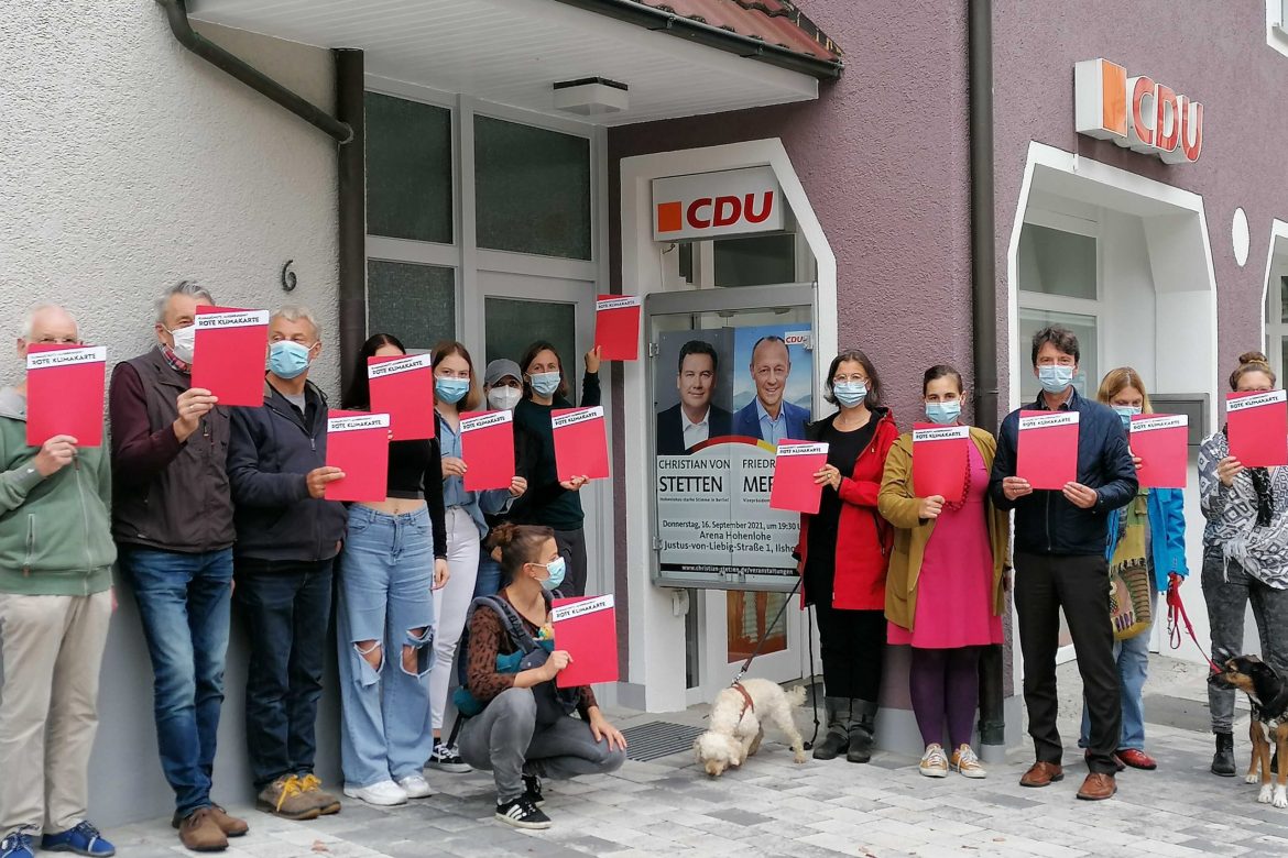 Hohenloher Bürger:innen zeigen Christian von Stetten die „Rote Klimakarte“ an der CDU-Zentrale in Künzelsau.