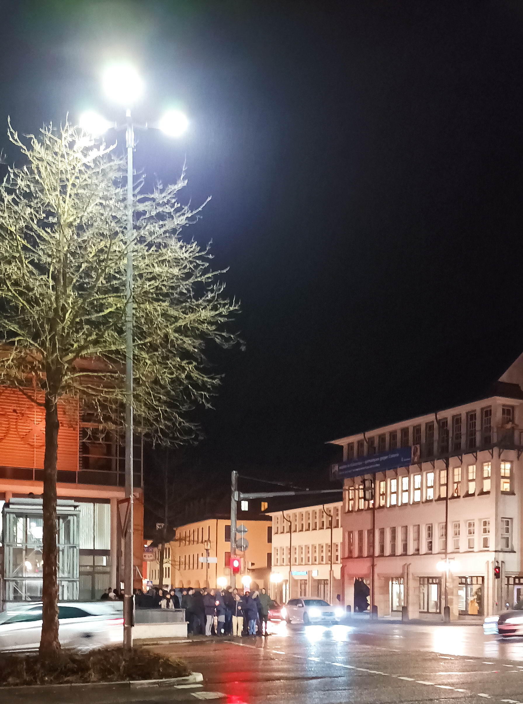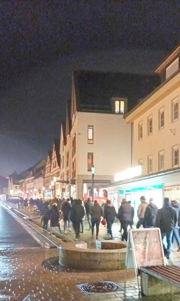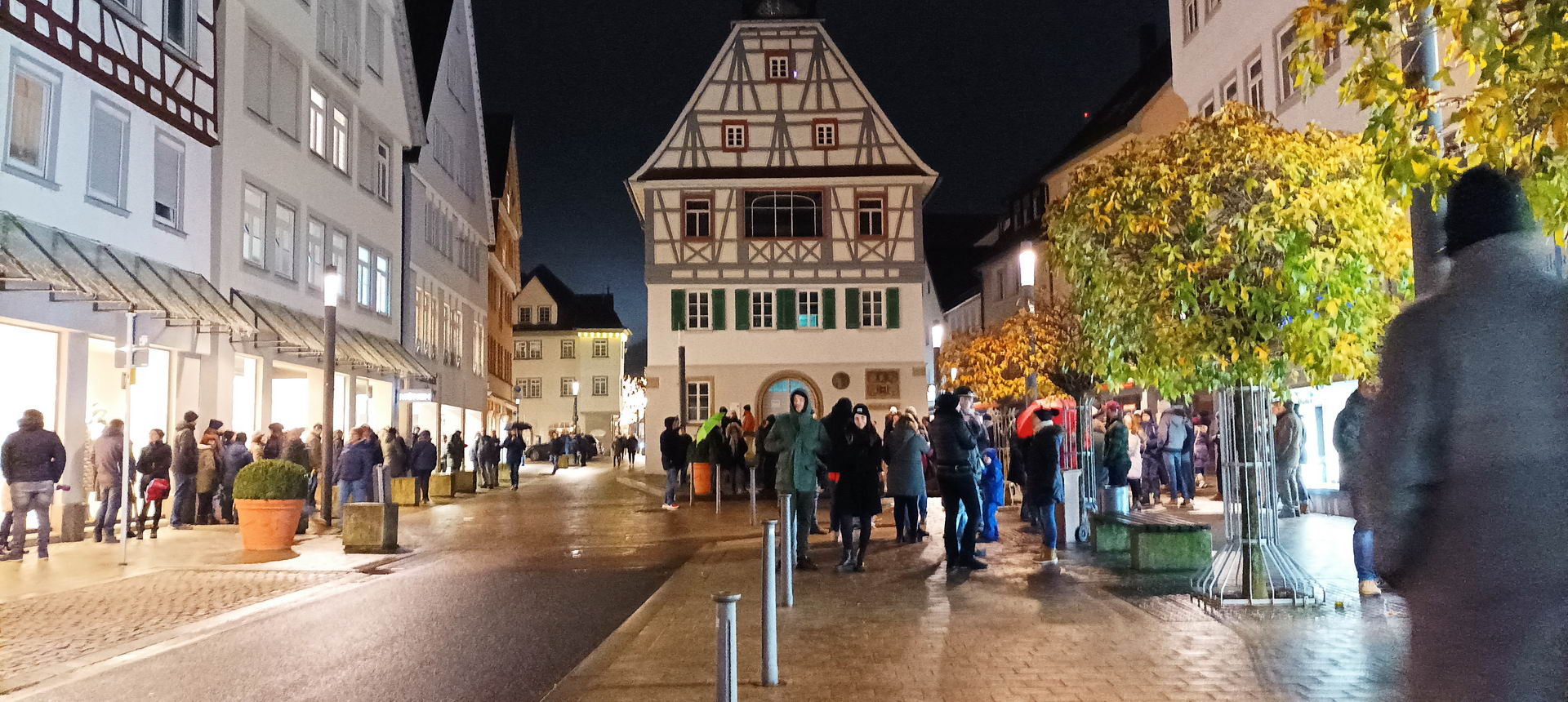 Mehrere hundert Menschen traf sich am Montag, den 17. Januar am alten Rathaus von Künzelsau. Es mögen 500 gewesen sein, die Schätzung ist schwierig. Kurz nach 18 Uhr starteten sie einen Rundgang durch die Stadt – was sie wollten, ist unklar, denn es gab keinerlei Protestschilder, keine Sprechchöre … gar nichts. Geradezu gespenstisch und leise zog der Zug durch die Stadt, nur einige wenige Spaziergänger:innen trugen Kerzenlicht mit sich. Die Verkehrsregeln wurden eingehalten – der Zug bewegte sich nicht auf der Fahrbahn, auch die rote Fußgängerampel am Rathaus wurde befolgt. Auf die Frage, warum sie hier demonstriere, antwortete eine Frau: „Das ist keine Demonstration, ich gehe hier spazieren.“