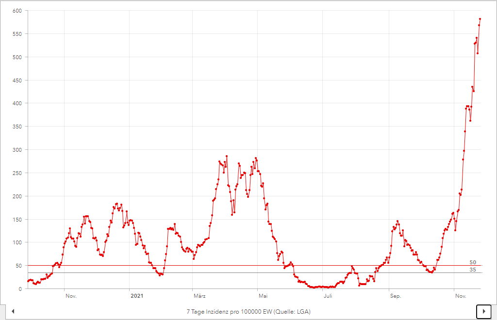 Inzidenz-Entwicklung im HOK. Der neue Höchststand von 671 ist noch nicht enthalten.