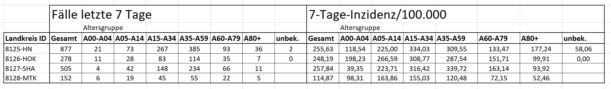 Dazu könnte die 7-Tage-Inzidenz bezogen auf die einzelnen Altersgruppen eine gute Maßzahl sein, vor allem deshalb, weil für die Anzahl der positiv getesteten Test pro Altersgruppe sowie der Anteil der Kohorte innerhalb der Gesamtbevölkerung Daten zur Verfügung stehen: Die Anzahl der Positivtests werden durch das RKI bereitgestellt, die Bevölkerungszahlen stellt das DESTATIS (früher: Statistisches Bundesamt) bereit. Allerdings sind dort die Altersgruppen etwas anders gewählt als in den Zahlen des Hohenlohekreises.
