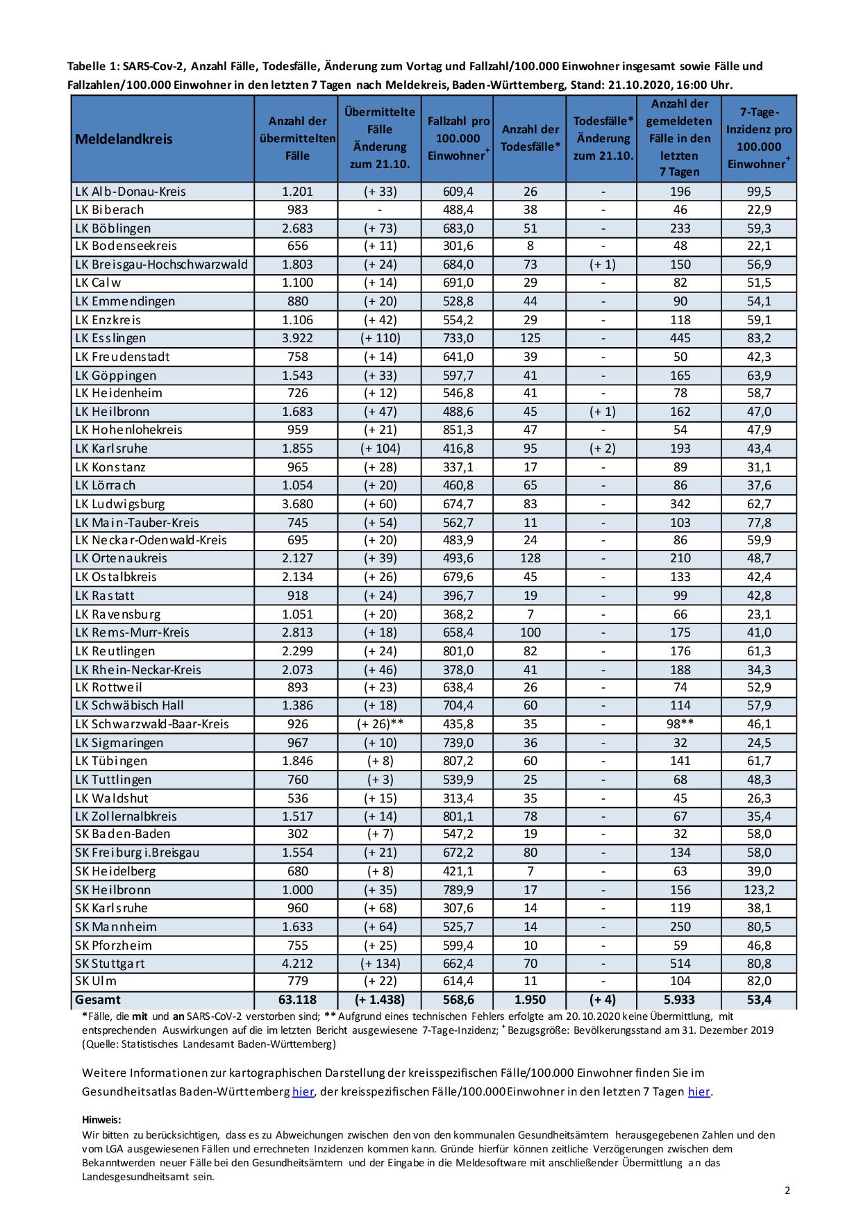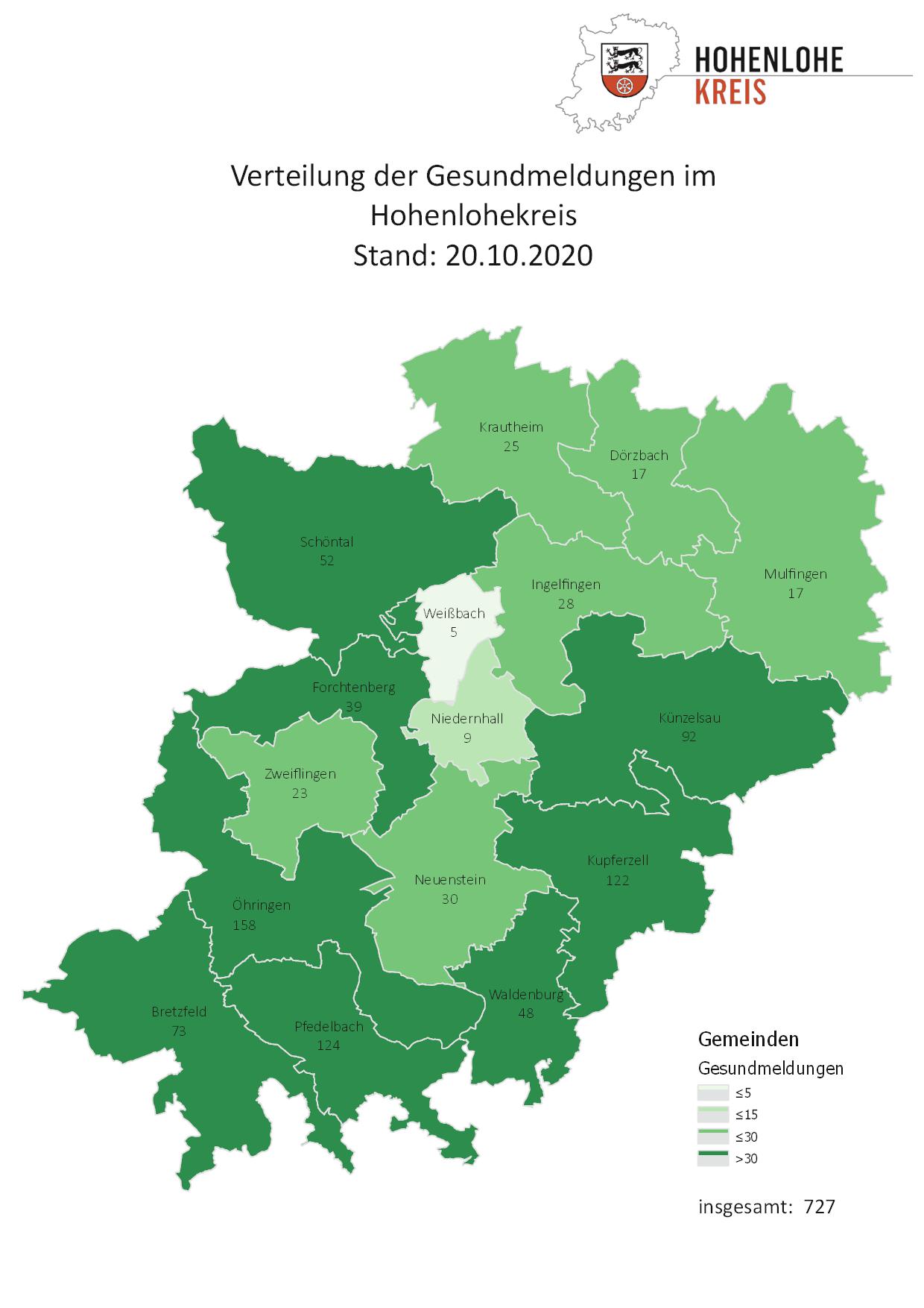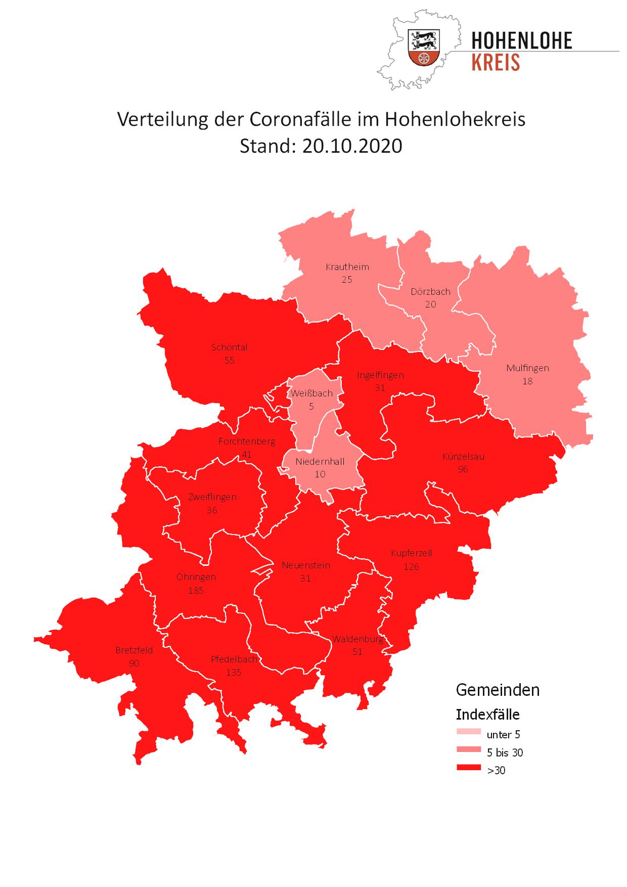 Am Mittwoch, den 21. Oktober 2020, hat der Hohenlohekreis laut einer Pressemitteilung mit einer 7-Tage-Inzidenz von 47,9 pro 100.000 Einwohner die erste Corona-Stufe, die sogenannte Vorwarnstufe, erreicht. Insgesamt wurden dem Gesundheitsamt des Hohenlohekreises am Mittwoch 21 Corona-Infektionen bestätigt. Mehr als 120 Kontaktpersonen wurden daraufhin von den Fallermittlern ausfindig gemacht. Einige Betroffene, die positiv sind, befanden sich bereits als K1-Personen in Quarantäne.