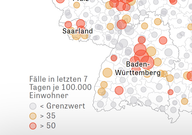 Noch überschreitet der Hohenlohekreis keine der beiden Warnstufen. Quelle: Screenshot DIE ZEIT, 15.10.2020