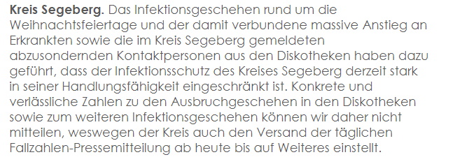 Erst Ende dieser Woche rechnet das RKI wieder mit einer verläßlichen Datenlage. Ganze Landkreise sind mit der Erfassung der Daten derzeit überfordert. So zum Beispiel der Kreis Segeberg in Schleswig-Holstein, der nach gleich mehreren Corona-Ausbrüchen in Klubs im Kreis und in Nachbarkreisen feststellen muß: