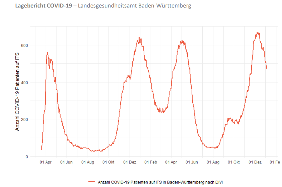 Über die Auswirkungen der Omikron-Variante ist weiterhin nur wenig bekannt, jedoch zeichnet sich ab, dass die Omikron-Variante zwar infektiöser ist als Delta, aber die Verläufe in der Regel nicht so schwer sind wie bei Delta. Das stimmt den Koordinator für die intensivmedizinische Versorgung von Covidpatienten in Baden-Württemberg, Götz Geldner, gedämpft optimistisch: In seiner Klinik, dem RKH-Klinikum in Ludwigsburg, gebe es keine Omikron-Patienten auf der Intensivstation. Der Krankheitsverlauf sei bei Omikron deutlich leichter, so Geldners Erfahrung. Da die Delta-Infektionen auf den ITS rückläufig seien, rechnet er nicht mehr mit einer Überlastung der Intensivstationen.