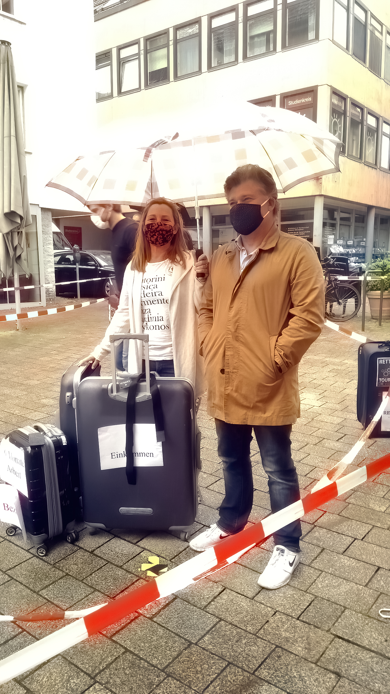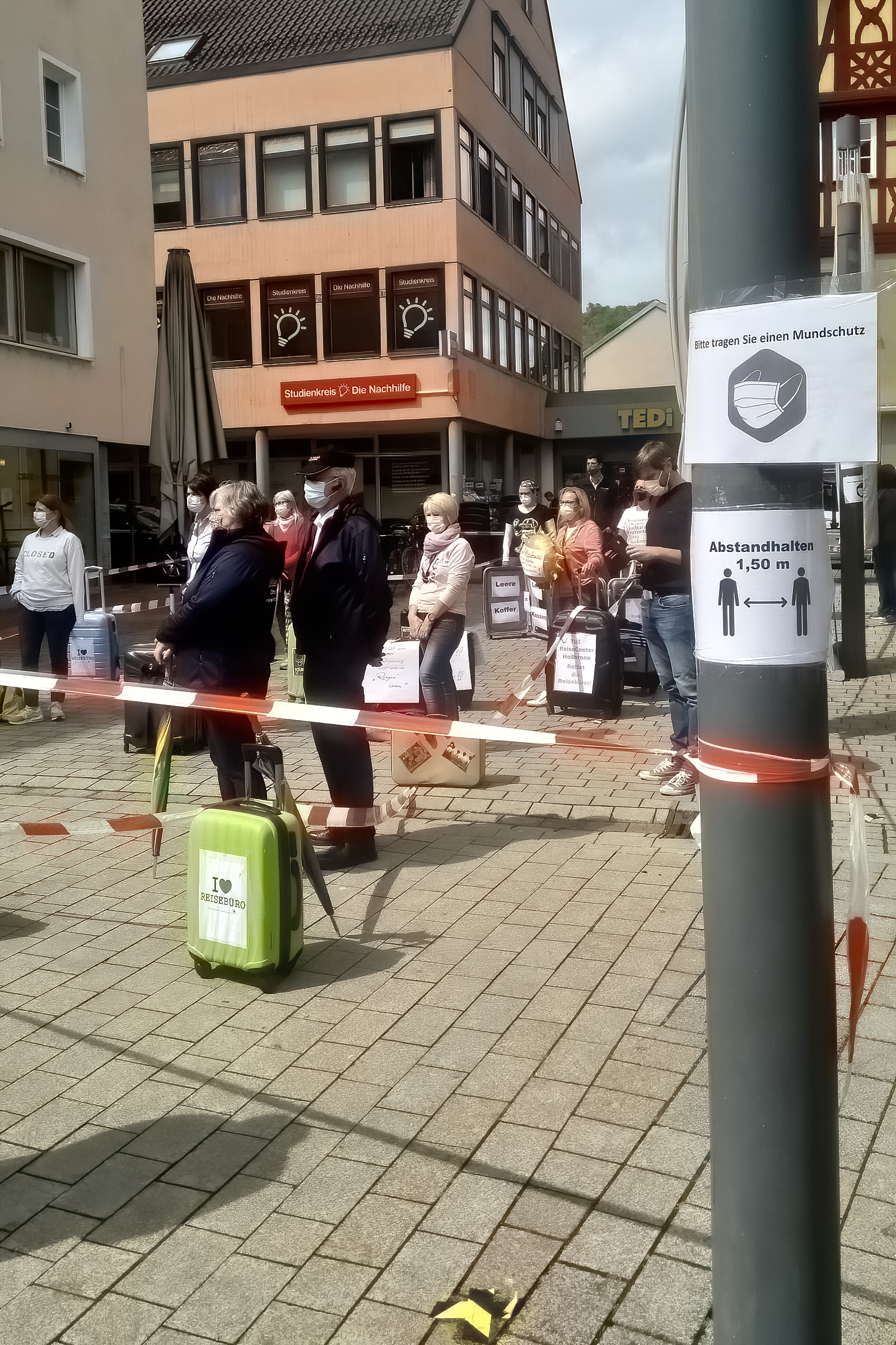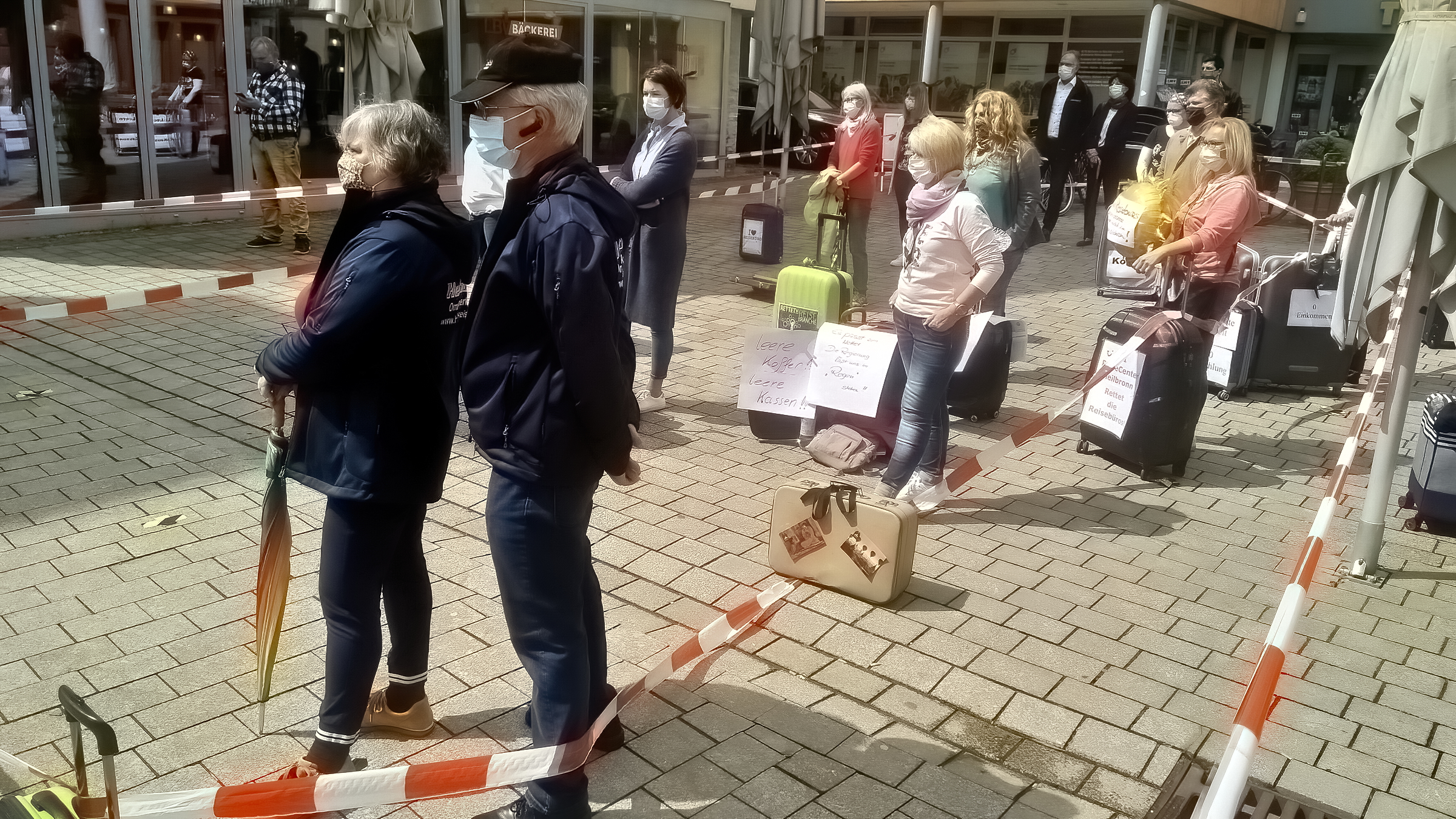 Joachim und Peggy Schmidt vom TUI-Reisecenter haben die Demonstration in Künzelsau organisiert. Zirka 25 Demonstranten aus der weiteren Region und etwa 25 Passanten hatten sich in der Kreisstadt eingefunden. Peggy Schmidt fordert eine Unterstützung der Branche von staatlicher Seite: „Wir sind die ersten, die betroffen waren und wir werden auch die letzten sein, die wieder aus der Krise kommen“, erklärt sie. Die Reisebüros hätten besonders zu leiden, da sie im Moment keinerlei Einnahmen erzielen können, aber mit der Rückabwicklung der Reisen einen erheblichen Aufwand hätten. Auch die bereits erhaltenen Provisionen müssten bei Stornierung an die Unternehmen rückerstattet werden. Außer Joachim und Peggy Schmidt arbeiten im TUI-Reisecenter eine Mitarbeiterin und eine Auszubildende. In Deutschland arbeiten etwa 80.000 bis 100.000 Menschen in Reisbüros, in der gesamten Reisebranche gibt es nach Angaben des Deutschen Reiseverbandes etwa 2.9 Millionen Arbeitsplätze.