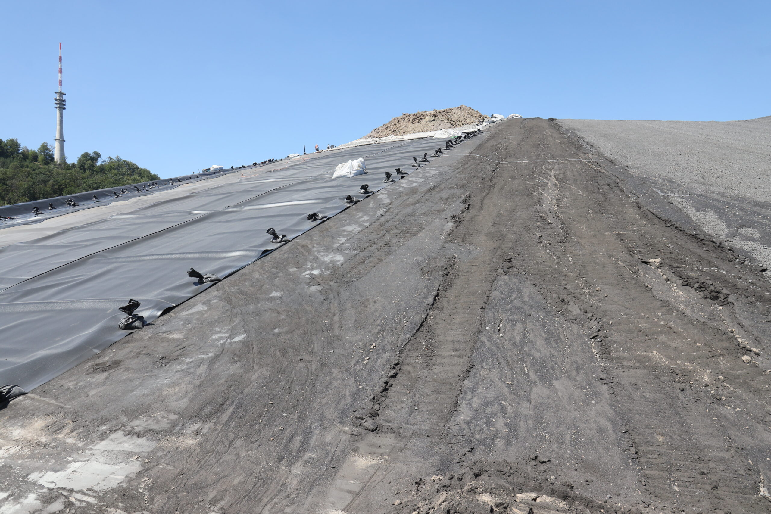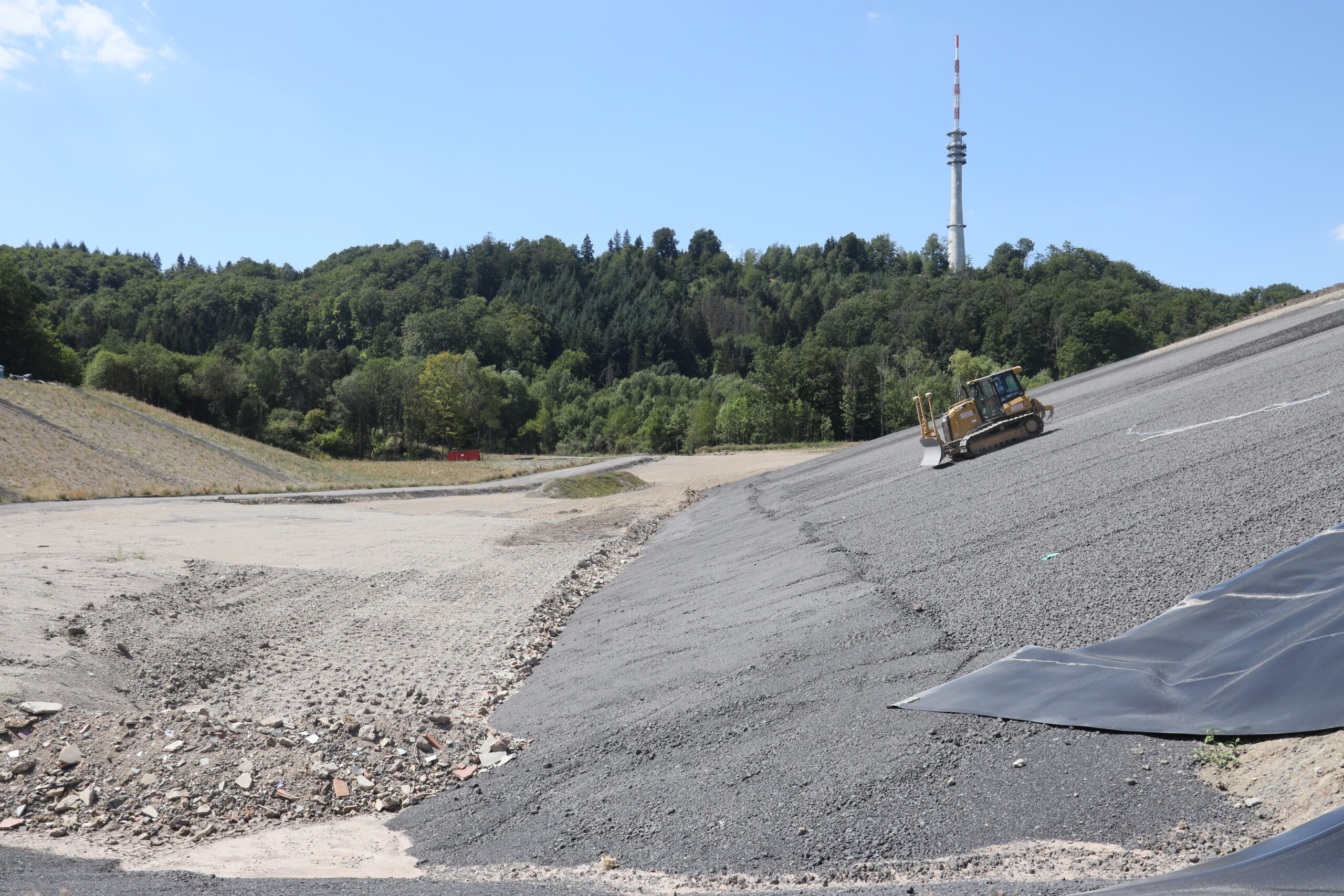 Direkt neben dem Wertstoffhof liegt die Mülldeponie. Seit 1980 ist sie im Betrieb. Schwere Baumaschinen fahren auf der Deponie herum. Fritsch erklärt, dass der alte Teil der Deponie gerade abgedeckt wird: „Mehrere unterschiedliche Schichten werden zu Abdichtung aufgetragen, dann kommt noch eine Folie drauf.“ Und zum Schluss soll die abgedichtete Deponie begrünt werden. Ziel ist es, dass kein Oberflächenwasser in die Deponie eindringen kann und das Oberflächenwasser ohne Kontakt zu den Abfällen an der Oberfläche in die Bäche abfließen kann.