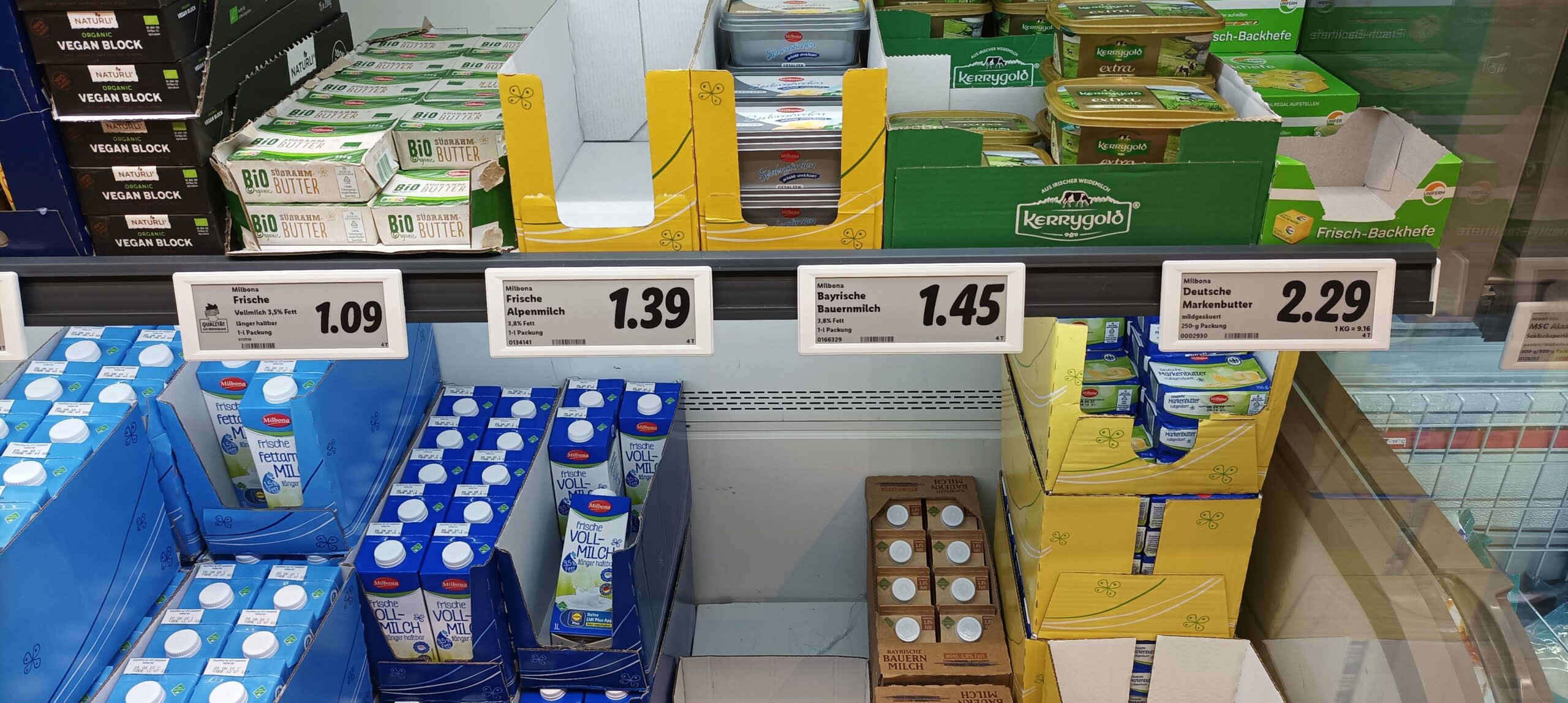 Butter beim Discounter kostete Anfang des Jahres 1,29 Euro – inzwischen muss man mit über 2 Euro für das halbe Pfund rechnen. Und die Milch, deren niedriger Preis von um 0,75 Euro vor wenigen Monaten noch Bauernproteste hervorrief, kostet jetzt beim Discounter 1,39 Euro.
