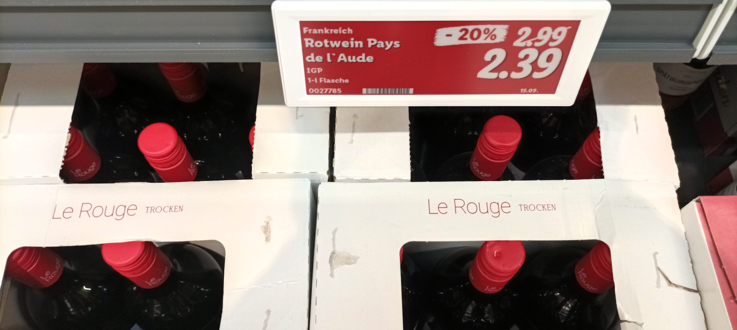 Selbst wer sich die Situation schöntrinken möchte, muss feststellen, dass der preiswerte Rotwein aus Frankreich nicht mehr 1,99 Euro kostet. Immerhin wurde der Preis gerade wieder herabgesetzt, 2,99 Euro war wohl zuviel des Guten für die Zielgruppe der preissensitiven Weinliebhaber.