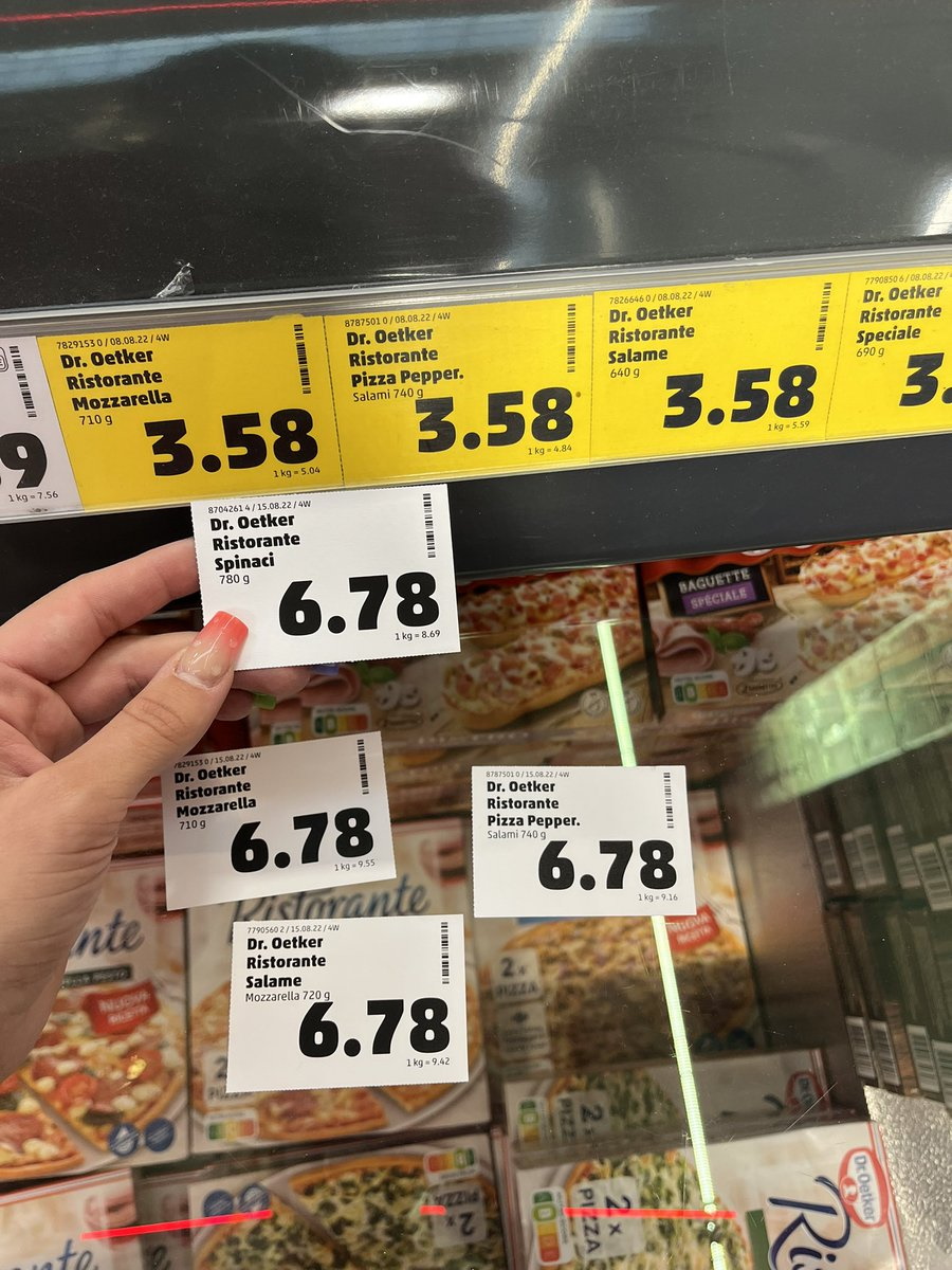 Richtig deutlich zeigt sich die Preissteigerung bei den verarbeiteten Nahrungsmitteln. Je mehr energieintensive Verarbeitungsschritte, desto stärker zeigen sich die Auswirkungen der Energiekosten. Ein drastisches Beispiel macht bei twitter die Runde, angeblich wurde das Foto von einer Verkäuferin aufgenommen, die gerade Preisschilder austauscht. Ein Preissprung von fast 90 Prozent ist darauf zu sehen: