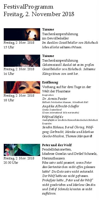 in Waldenburg-Hohebuch. Von Freitag, den 02. November 2018, ab 15 Uhr, bis Sonntag, den 04. November 2018, führen verschiedene Marionettentheater unterschiedliche Stücke auf. Gmelin und Schmelz präsentieren mit ihren selbst gemachten Marionetten unter anderem das Stück „Peter und der Wolf“. Das Marionettentheater Zauberfaden von Christel Albrecht und Ursula Doll aus Lautenbach spielt das Kinderstück „Die mutigen Freunde“ (ab vier Jahre). Los geht es am Freitag um 15 Uhr mit einer Taschenlampenführung im Gewölbekeller in Hohebuch, in dem allerlei