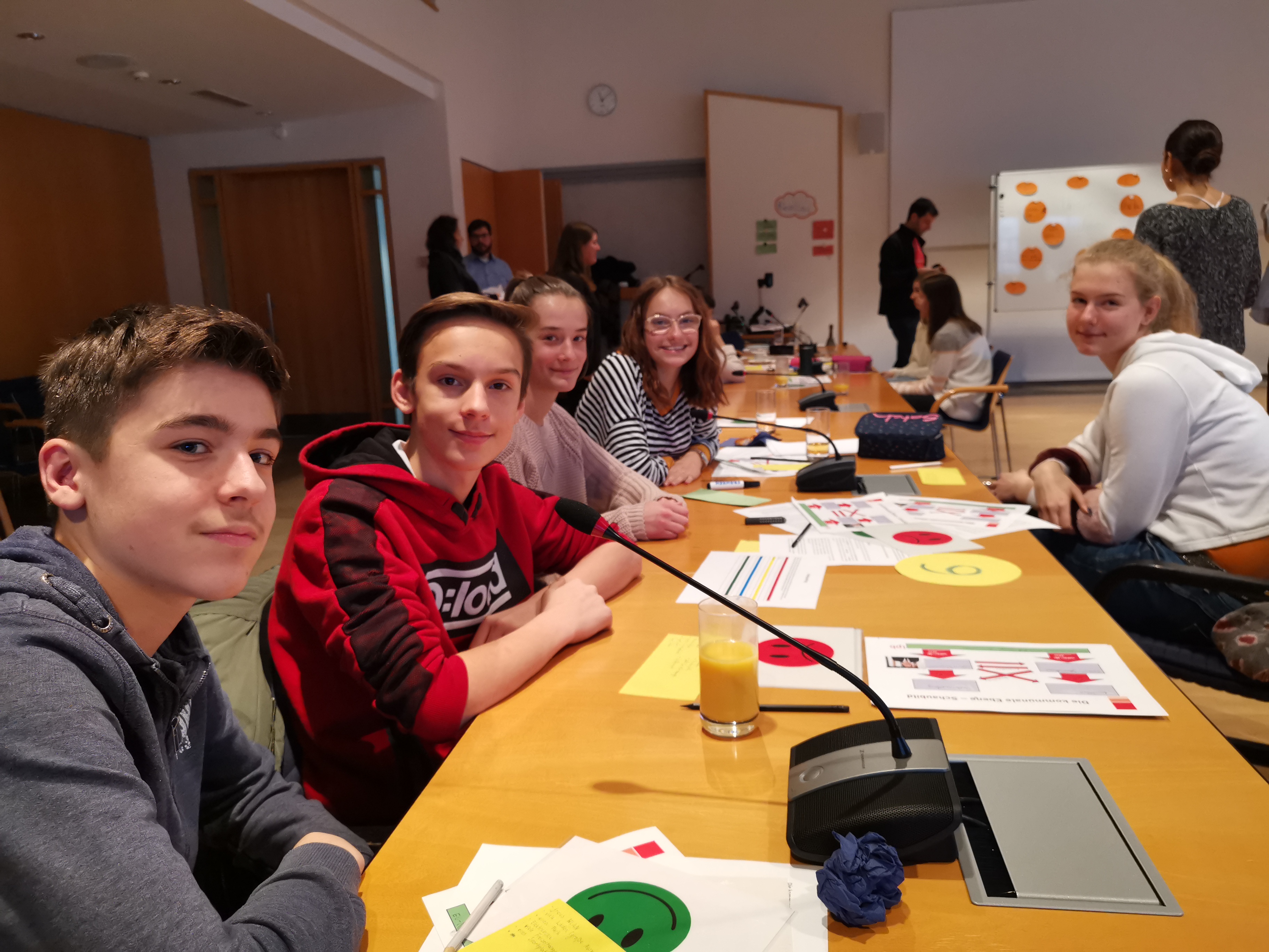 In Gruppe eins geht es sehr lebhaft zu, aber Mateo (14) aus Künzelsau, Mattis (13) aus Kupferzell, Franziska aus Kocherstetten (13), Julia aus Waldenburg (13), Stella aus Künzelsau-Taläcker (13) und Sofia aus Gaisbach (13) sind sich schnell einig. Ein Kreidebomben-Festival oder ein Musikfestival täte Künzelsau gut. „Wenn wir Konzerte hier veranstalten, dann kommen auch mehr Menschen nach Künzelsau“, versucht Mateo die anderen in seiner Gruppe von seiner Idee zu überzeugen. Aber auch ein kostenloser Nahverkehr beziehungsweise generell ein besserer Nahverkehr ist im Gespräch und dass es zu wenig Einkaufsmöglichkeiten in Künzelsau gibt. Am Ende aber stellen sie den anderen Schülergruppen ihre Festival-Idee vor. Julia (13) aus Waldenburg erkärt: „Wir haben uns für ein Musikfestival entschieden. Es gibt ja schon das Würth-Open-Air. Aber die Musik mag nicht jeder. Durch das Festival wird auch die Stadt attraktiver und es kommen auch mehr nach Künzelsau. Wenn die Stadt größer wird, werden auch mehr Steuern eingenommen, es könnten mehr neue Läden angezogen werden. Auch der Bürgermeister profitiert davon, denn seine Chancen steigen, dass er wiedergewählt wird.“