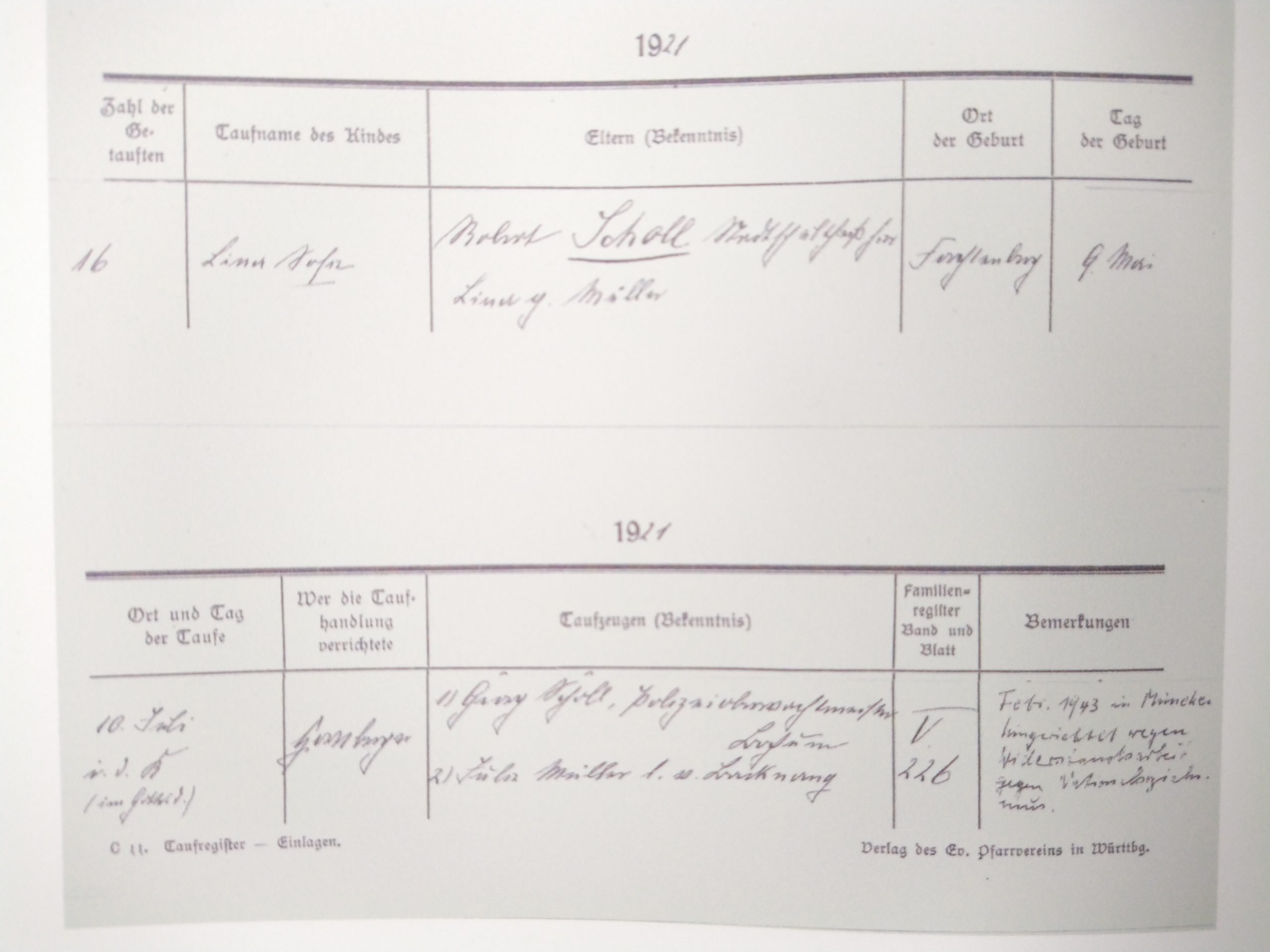 Auszug aus dem Forchtenberger Taufregister mit dem Eintrag für Sophie Scholl. Foto: GSCHWÄTZ