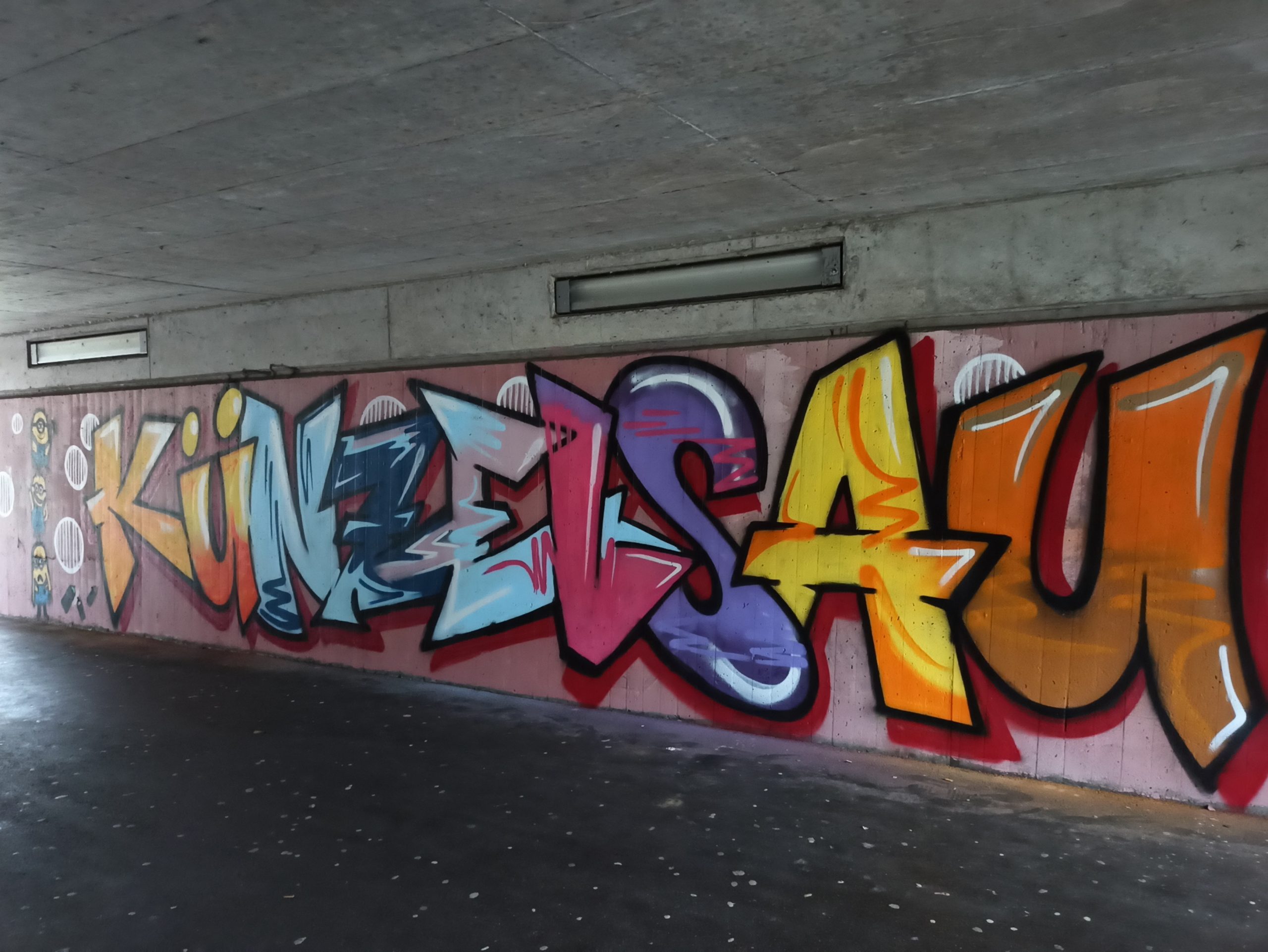 Die Unterführung vom Busbahnhof zur Schillerstraße in Künzelsau strahlt in neuem Glanz: Gemeinsam mit dem Graffitikünstler Richard Koch hat die Klasse 9b der Georg-Wagner-Schule ein neues, farbenfrohes Street-Art-Projekt umgesetzt. Unter dem Motto „Künzelsau ist bunt“ wurden verschiedene Elemente, Figuren und Schriftzüge, die von den Schülerinnen und Schülern gestaltet wurden, in einem Gesamtkunstwerk festgehalten. Das geht aus einer Pressemitteilung der Stadt Künzelsau hervor.