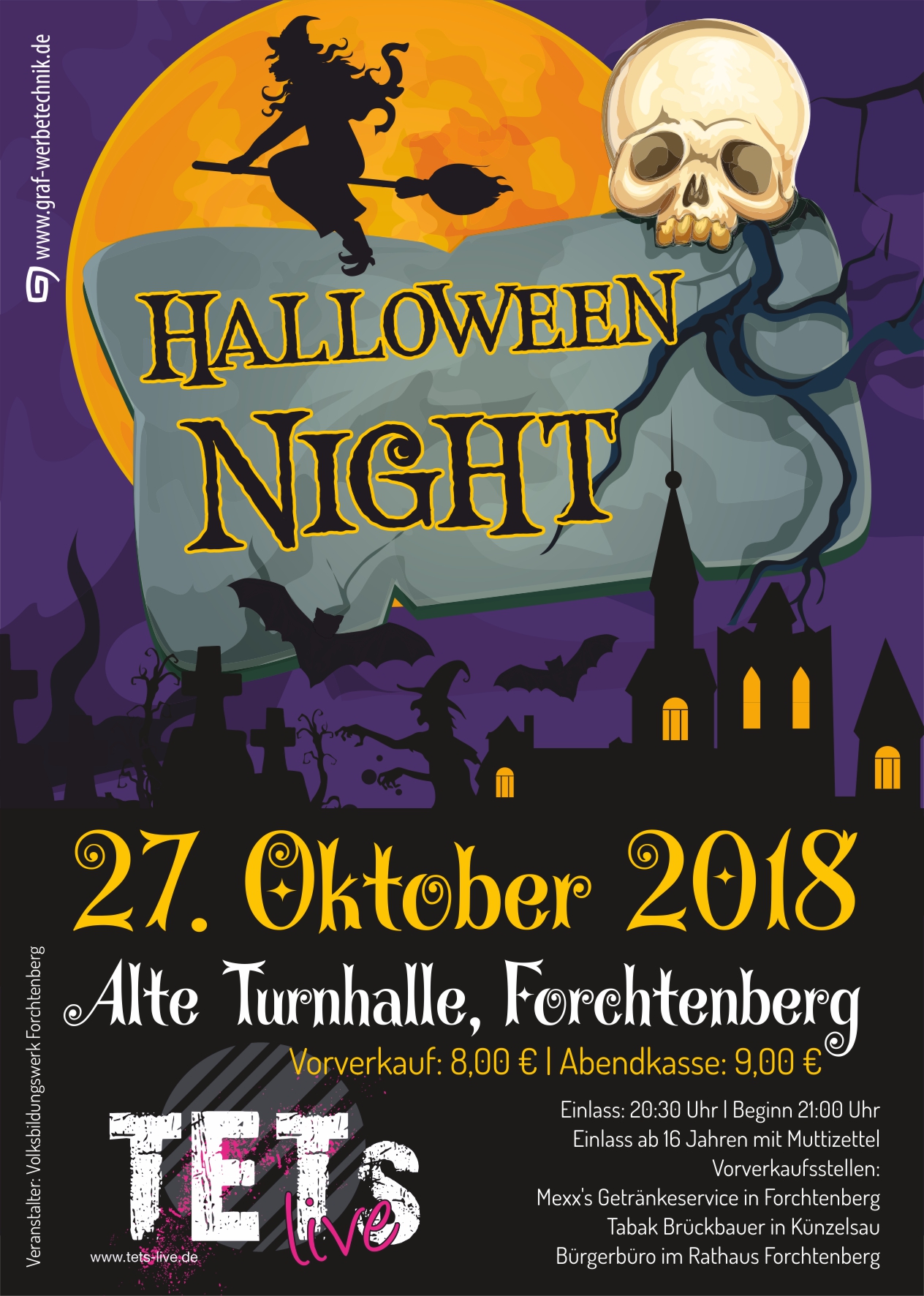 Vor gut 150 Jahren brachten die katholischen Iren ‚Halloween‘ als Brauchtum mit in die neue Welt, sprich, nach Amerika. Von dort reimportierte es die Konsumgüterindustrie vor gut zehn Jahren zurück nach Europa, auch nach Deutschland. Wörtlich übersetzt benennt es den Abend und die Nacht vor Allerheiligen. Ausgehöhlte Kürbisse, grimmige Gesichter und ein gewisser Totenkult plus Horrormaske gehören einfach dazu. Auf den haben sich die Veranstalter Nadja Herzog, Jan Golgath und das Volksbildungswerk aber nicht konzentriert. Und so feierten und tanzten rund 350 Hohenloher am 27. Oktober 2017 in der Forchtenberger Turnhalle bis in die frühen Morgenstunden. Der Musikgruppe Tets war‘s gedankt. Videoreporter Dr. Felix Kribus hat sich furchtlos zwischen Kunstblut verzierten Gesichtern und von der Decke hängenden Plastikskeletten bewegt.