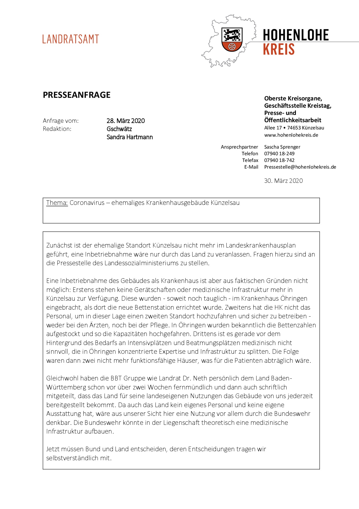 Kühn: In Öhringen gibt es 12 Beatmungsplätze pro 110.000 Einwohner – wenn man die Narkosegeräte noch mit dazu zählt. Der Bundesdurchschnitt liegt hier rund dreimal so hoch bei 34 Beatmungsplätzen pro 100.000 Einwohner. Man darf dabei auch nicht vergessen: Jedes der 140 Betten im Künzelsauer Krankenhaus hätte Sauerstoffversorgung gehabt für die leichteren Fälle. Aber das jetzt auf die Schnelle wieder hochzuziehen, wird sehr schwierig werden. Jetzt sieht man mal, was passiert, wenn man auf viele Jahre das Gesundheitswesen auf Effizienz trimmt. Das reicht halt für eine Pandemie nicht.