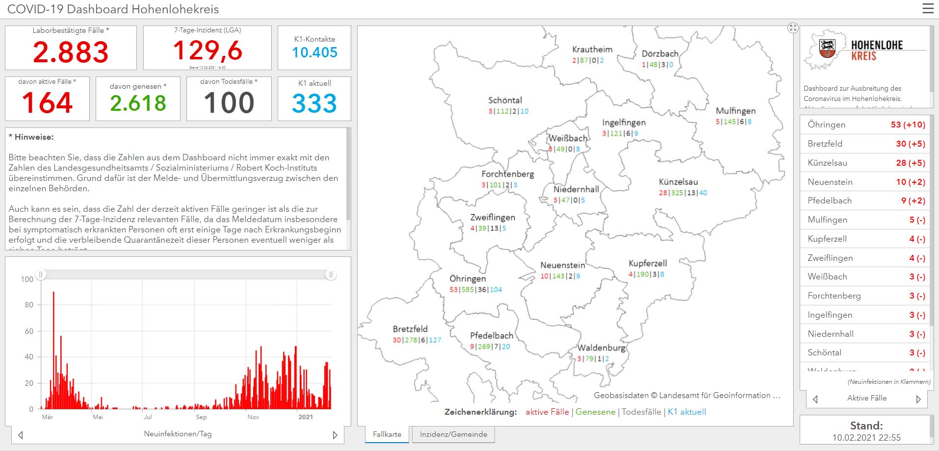 Bei dem bekannten Ausbruchsgeschehen in einem Hohenloher Unternehmen ist die Zahl der positiv bestätigten Fälle, die dem Hohenlohekreis zuzuordnen sind, um 12 auf 83 gestiegen. Darin enthalten sind auch bereits die Fälle, die aus Kontaktpersonen resultieren. Außerdem sind in diesem Zusammenhang mittlerweile 16 Fälle der Virusvariante B.1.1.7 durch das Labor des Landesgesundheitsamtes bestätigt worden.