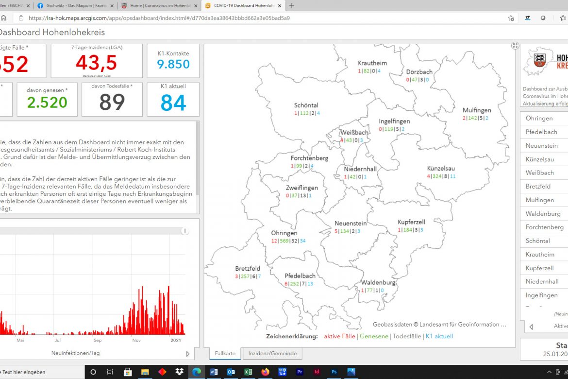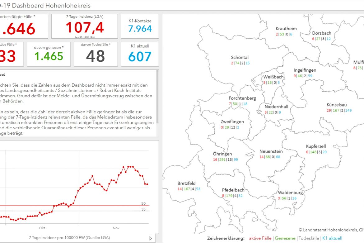 Coronalage Hohenlohekreis: Inzidenz jetzt bei 107,4 Fällen pro 100.000 Einwohner, Tendenz sinkend.