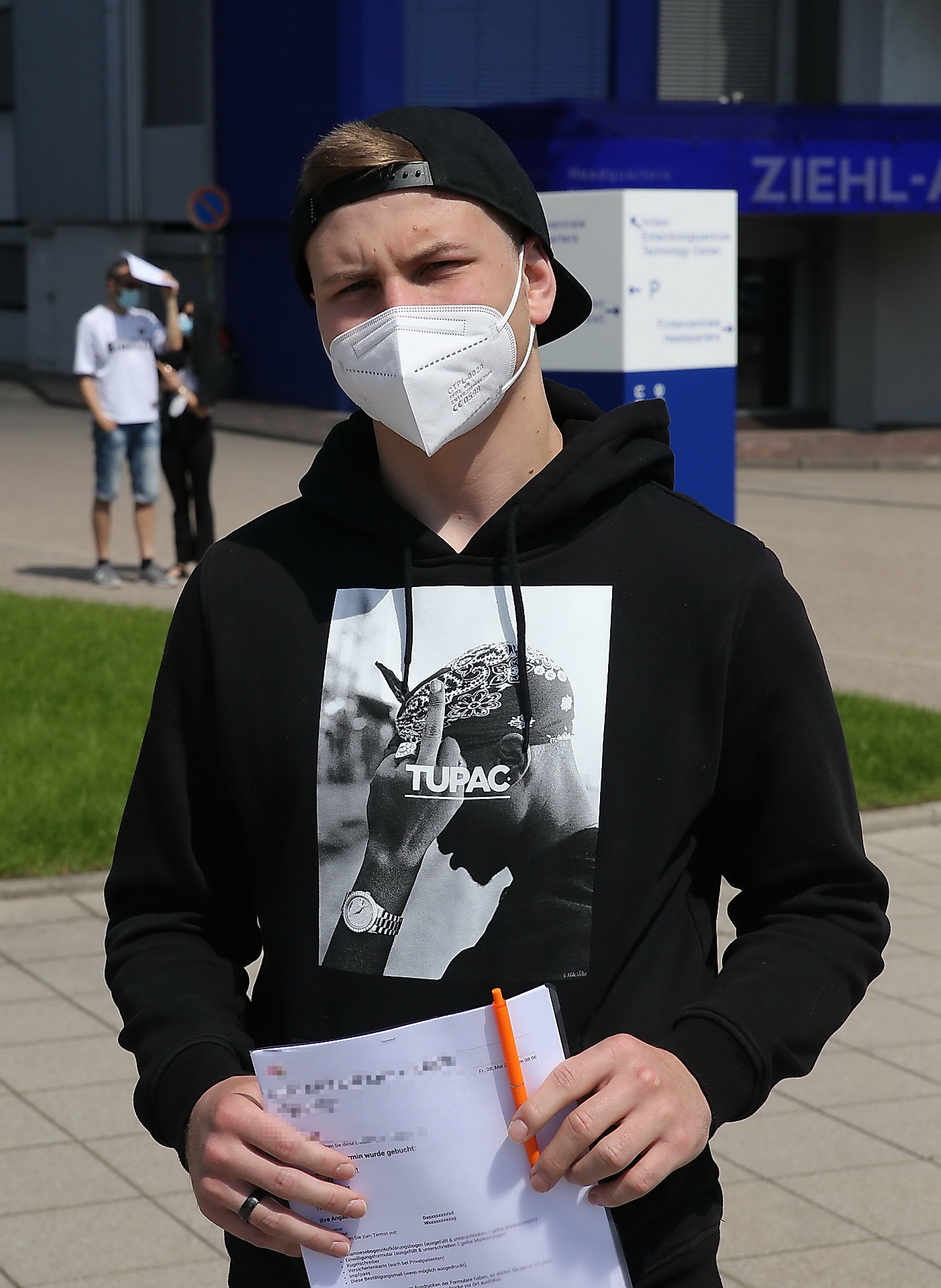 Aus Kornwestheim angereist sind Jürgen und Marina. Ihr Arbeitgeber ist ein Geschäftspartner von Ziehl-Abegg und sie haben über einen Ansprechpartner von Ziehl-Abegg von der Aktion erfahren. Jürgen spricht von „Glück“ und „Connections“, die man haben müsse. Sie beide seien „zu jung“, hätten „keine Chance gehabt“. Er ist „dankbar, die Chance zu kriegen“. Marina hätte „beim Betriebsarzt demnächst“ ein Impfangebot erhalten, aber sie nimmt jetzt dieses Angebot wahr.